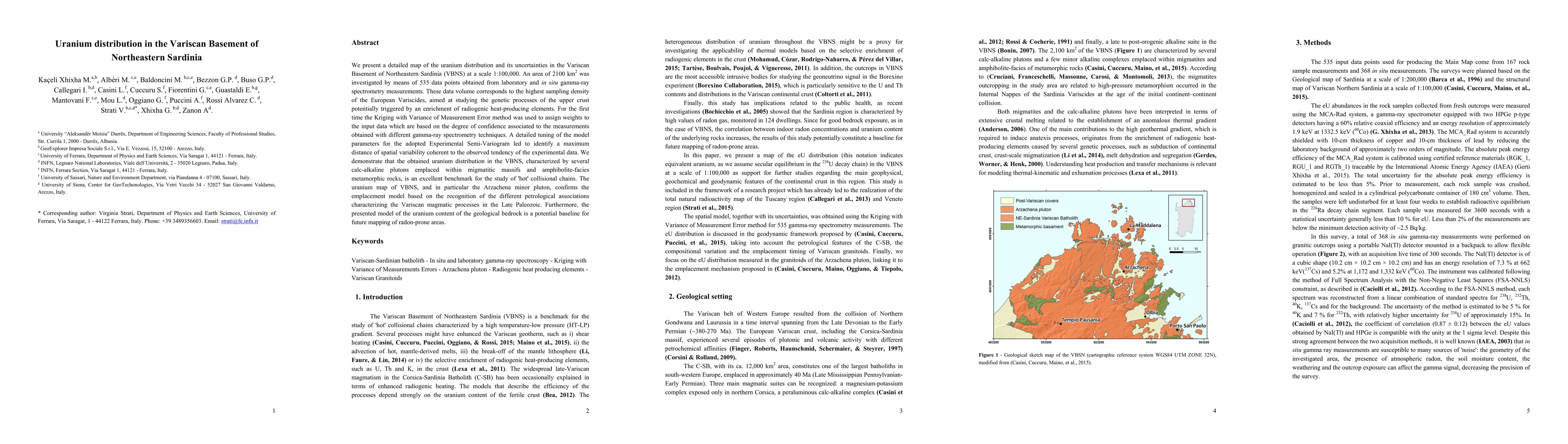 We present a detailed map of the uranium distribution and its uncertainties in the Variscan Basement of Northeastern Sardinia (VBNS) at a scale 1:100,000. An area of 2100 km2 was investigated by means of 535 data points obtained from laboratory and in situ gamma-ray spectrometry measurements. These data volume corresponds to the highest sampling density of the European Variscides, aimed at studying the genetic processes of the upper crust potentially triggered by an enrichment of radiogenic heat-producing elements. For the first time the Kriging with Variance of Measurement Error method was used to assign weights to the input data which are based on the degree of confidence associated to the measurements obtained with different gamma-ray spectrometry techniques. A detailed tuning of the model parameters for the adopted Experimental Semi-Variogram led to identify a maximum distance of spatial variability coherent to the observed tendency of the experimental data. We demonstrate that the obtained uranium distribution in the VBNS, characterized by several calc-alkaline plutons emplaced within migmatitic massifs and amphibolite-facies metamorphic rocks, is an excellent benchmark for the study of 'hot' collisional chains. The uranium map of VBNS, and in particular the Arzachena minor pluton, confirms the emplacement model based on the recognition of the different petrological associations characterizing the Variscan magmatic processes in the Late Paleozoic. Furthermore, the presented model of the uranium content of the geological bedrock is a potential baseline for future mapping of radon-prone areas.