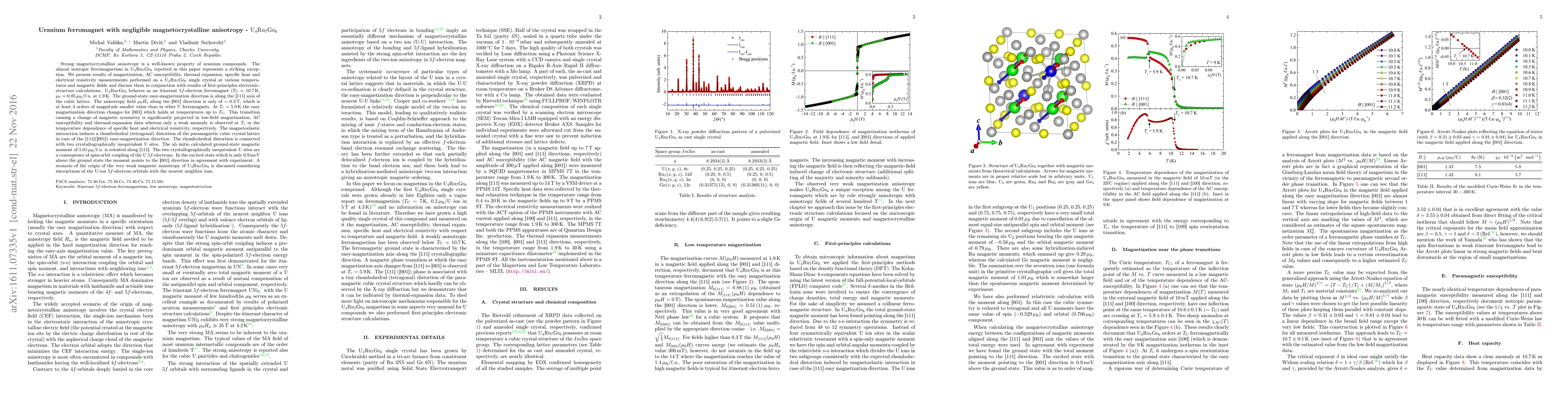 The paper presents U₄Ru₇Ge₆ as a unique uranium ferromagnet with negligible magnetocrystalline anisotropy, unlike typical uranium compounds. Through various measurements and first-principles calculations, researchers found it to be an itinerant 5f-electron ferromagnet with a Curie temperature of 10.7 K and magnetic moment of 0.85 μB/f.u. at 1.9 K. Its easy magnetization axis is [111] at low temperatures, changing to [001] at 5.9 K. The anisotropy field is exceptionally low (~0.3 T), caused by magnetoelastic interaction and spin-orbit coupling of U 5f-electrons, resulting in two crystallographically inequivalent U sites.