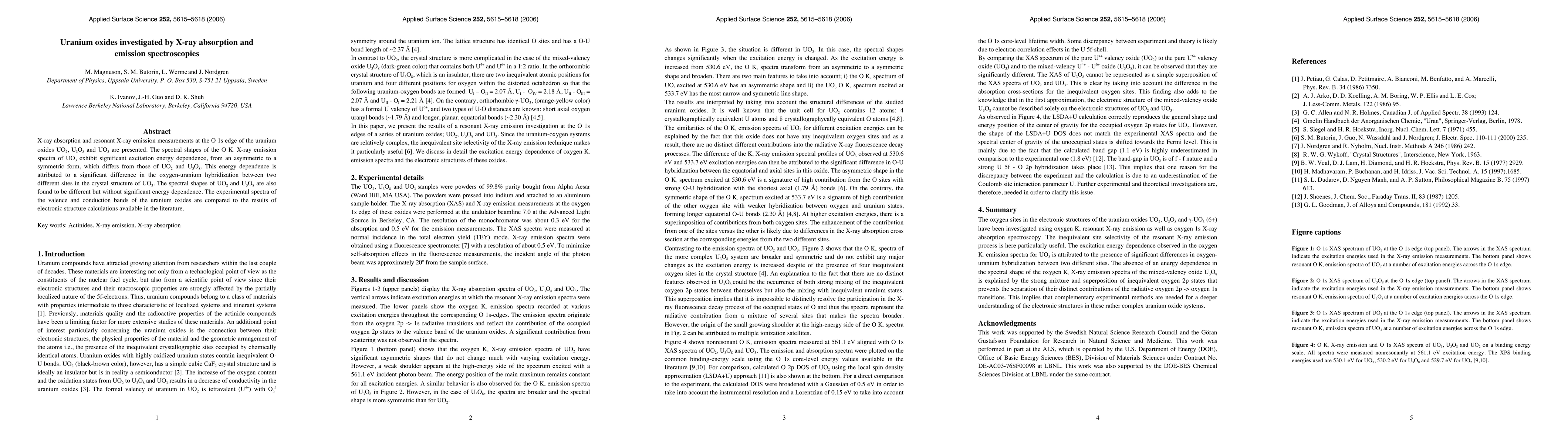 This study investigates uranium oxides (UO2, U3O8, and UO3) using X-ray absorption and emission spectroscopies, revealing significant excitation energy dependence in the O Kα emission spectra of UO3 due to differing oxygen-uranium hybridization. The spectral shapes of UO2 and U3O8 are distinct but show no significant energy dependence, and are compared with electronic structure calculations.