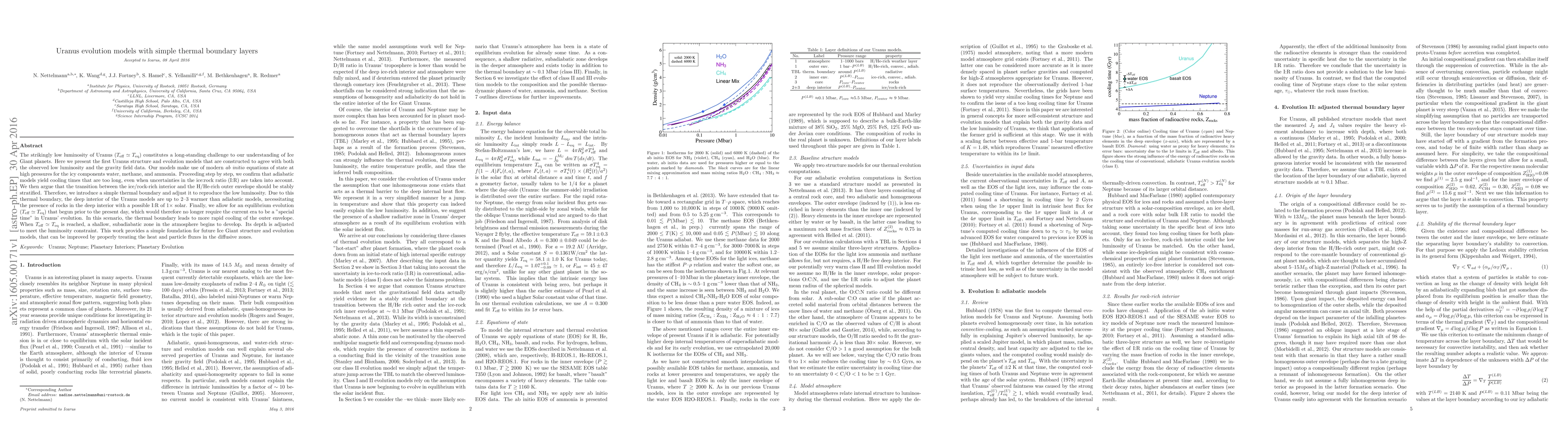 This paper presents Uranus evolution models incorporating a simple thermal boundary layer to explain its low luminosity, suggesting that the deep interior is warmer than adiabatic models due to a stratified transition zone. The models propose an equilibrium evolution scenario that began before the present day, avoiding the need for the current era to be unique in Uranus's evolution.