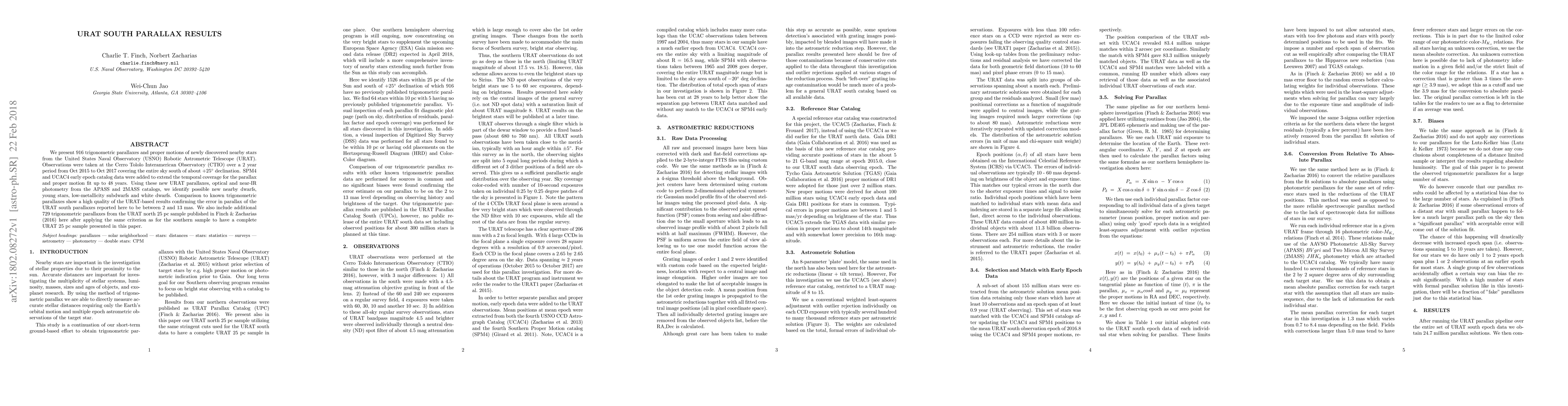The URAT South Parallax Results paper reports 916 new trigonometric parallaxes and proper motions of nearby stars, identifying new nearby dwarfs, young stars, and white dwarfs. The URAT-based parallaxes show high quality with an error range of 2 to 13 mas, and are supplemented by 729 additional parallaxes from the URAT north 25 pc sample.