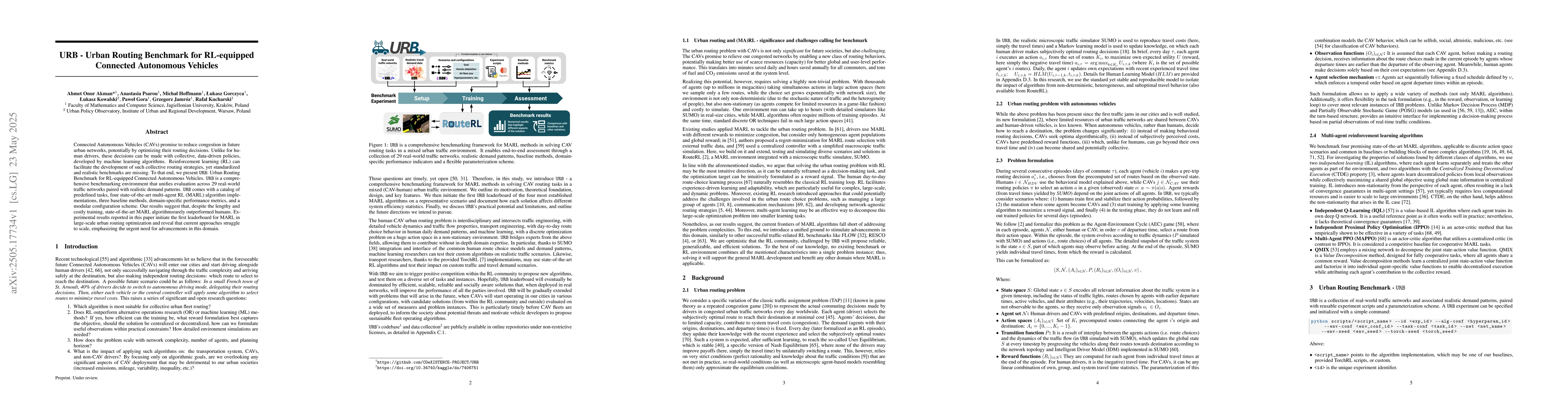 The research presents URB, a comprehensive benchmarking environment for evaluating reinforcement learning (RL) algorithms in large-scale urban routing optimization. URB unifies the evaluation across 29 real-world traffic networks paired with realistic demand patterns, providing a catalog of predefined tasks, MARL algorithm implementations, baseline methods, domain-specific performance metrics, and a modular configuration scheme.