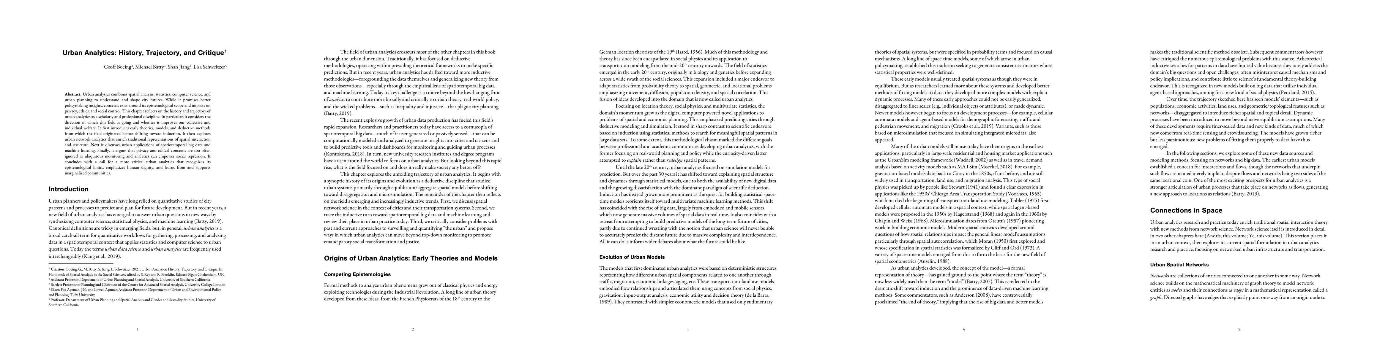 Urban analytics combines spatial analysis, statistics, computer science, and urban planning to understand and shape city futures. While it promises better policymaking insights, concerns exist around its epistemological scope and impacts on privacy, ethics, and social control. This chapter reflects on the history and trajectory of urban analytics as a scholarly and professional discipline. In particular, it considers the direction in which this field is going and whether it improves our collective and individual welfare. It first introduces early theories, models, and deductive methods from which the field originated before shifting toward induction. It then explores urban network analytics that enrich traditional representations of spatial interaction and structure. Next it discusses urban applications of spatiotemporal big data and machine learning. Finally, it argues that privacy and ethical concerns are too often ignored as ubiquitous monitoring and analytics can empower social repression. It concludes with a call for a more critical urban analytics that recognizes its epistemological limits, emphasizes human dignity, and learns from and supports marginalized communities.