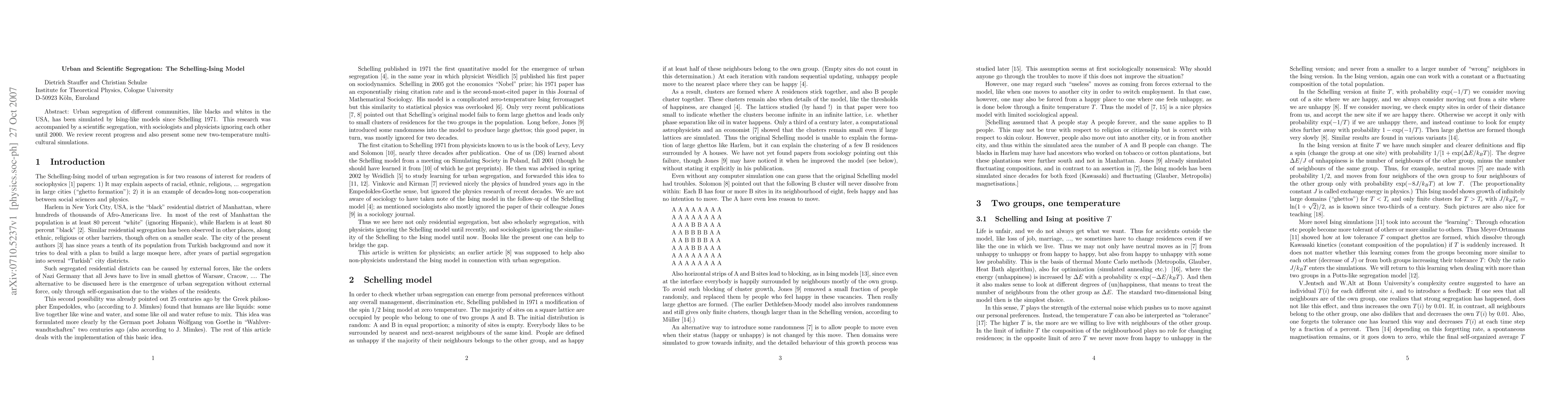 Urban segregation of different communities, like blacks and whites in the USA, has been simulated by Ising-like models since Schelling 1971. This research was accompanied by a scientific segregation, with sociologists and physicists ignoring each other until 2000. We review recent progress and also present some new two-temperature multi-cultural simulations.
