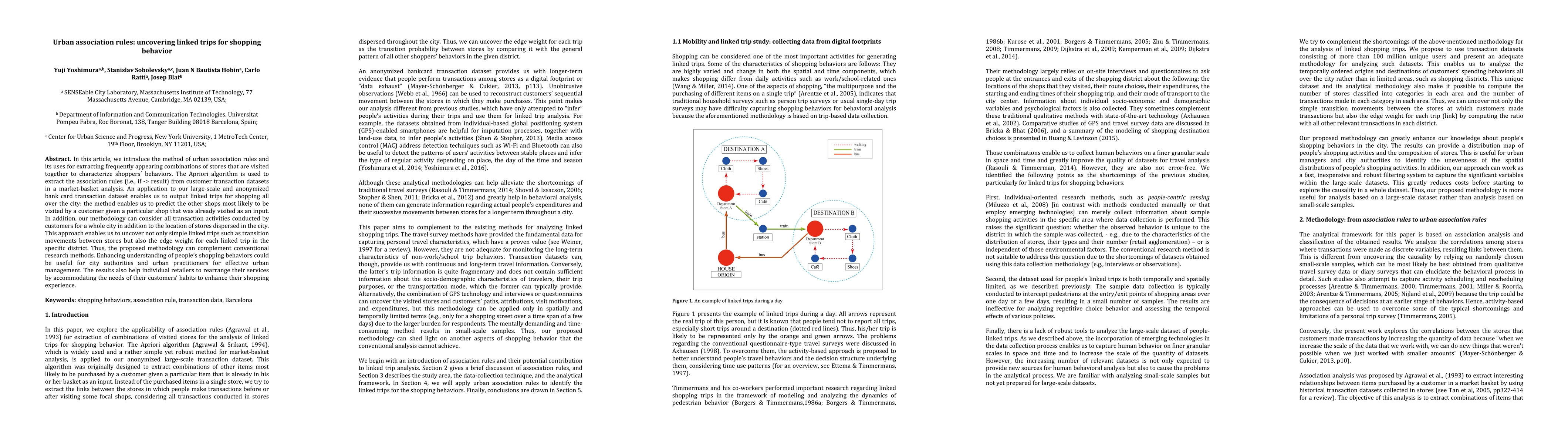 In this article, we introduce the method of urban association rules and its uses for extracting frequently appearing combinations of stores that are visited together to characterize shoppers' behaviors. The Apriori algorithm is used to extract the association rules (i.e., if -> result) from customer transaction datasets in a market-basket analysis. An application to our large-scale and anonymized bank card transaction dataset enables us to output linked trips for shopping all over the city: the method enables us to predict the other shops most likely to be visited by a customer given a particular shop that was already visited as an input. In addition, our methodology can consider all transaction activities conducted by customers for a whole city in addition to the location of stores dispersed in the city. This approach enables us to uncover not only simple linked trips such as transition movements between stores but also the edge weight for each linked trip in the specific district. Thus, the proposed methodology can complement conventional research methods. Enhancing understanding of people's shopping behaviors could be useful for city authorities and urban practitioners for effective urban management. The results also help individual retailers to rearrange their services by accommodating the needs of their customers' habits to enhance their shopping experience.