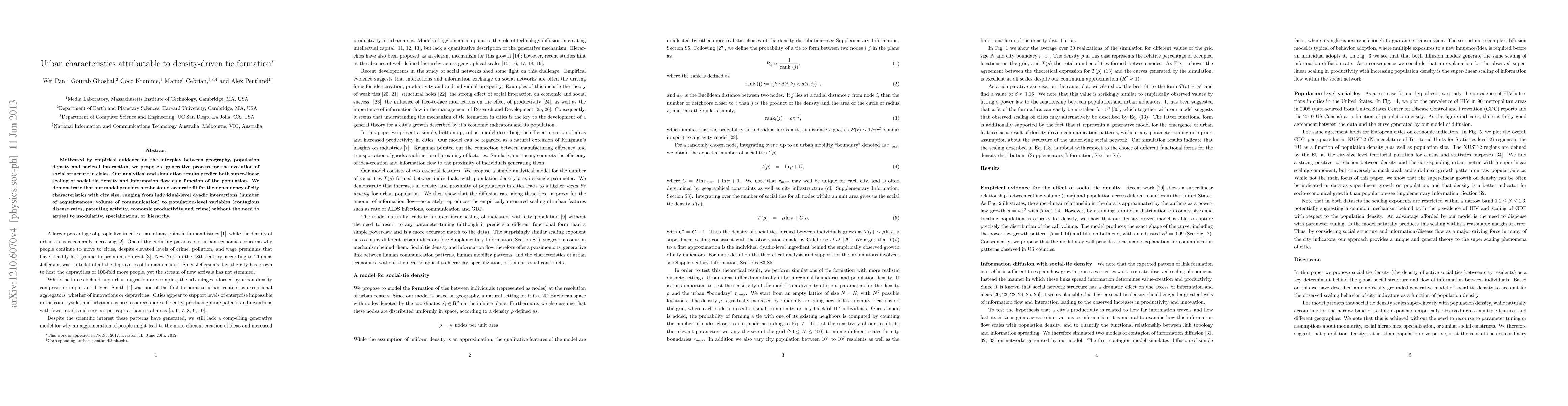 Motivated by empirical evidence on the interplay between geography, population density and societal interaction, we propose a generative process for the evolution of social structure in cities. Our analytical and simulation results predict both super-linear scaling of social tie density and information flow as a function of the population. We demonstrate that our model provides a robust and accurate fit for the dependency of city characteristics with city size, ranging from individual-level dyadic interactions (number of acquaintances, volume of communication) to population-level variables (contagious disease rates, patenting activity, economic productivity and crime) without the need to appeal to modularity, specialization, or hierarchy.