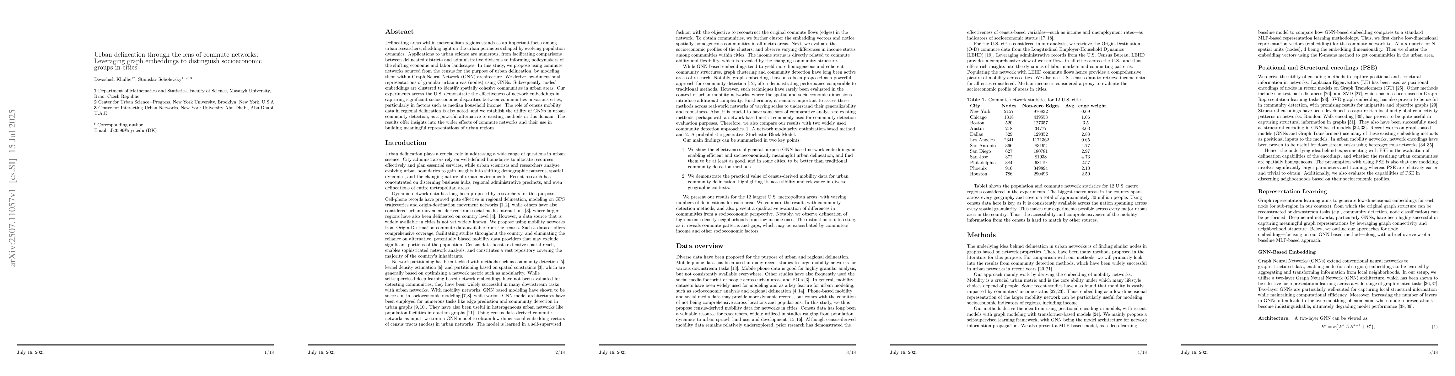 Delineating areas within metropolitan regions stands as an important focus among urban researchers, shedding light on the urban perimeters shaped by evolving population dynamics. Applications to urban science are numerous, from facilitating comparisons between delineated districts and administrative divisions to informing policymakers of the shifting economic and labor landscapes. In this study, we propose using commute networks sourced from the census for the purpose of urban delineation, by modeling them with a Graph Neural Network (GNN) architecture. We derive low-dimensional representations of granular urban areas (nodes) using GNNs. Subsequently, nodes' embeddings are clustered to identify spatially cohesive communities in urban areas. Our experiments across the U.S. demonstrate the effectiveness of network embeddings in capturing significant socioeconomic disparities between communities in various cities, particularly in factors such as median household income. The role of census mobility data in regional delineation is also noted, and we establish the utility of GNNs in urban community detection, as a powerful alternative to existing methods in this domain. The results offer insights into the wider effects of commute networks and their use in building meaningful representations of urban regions.