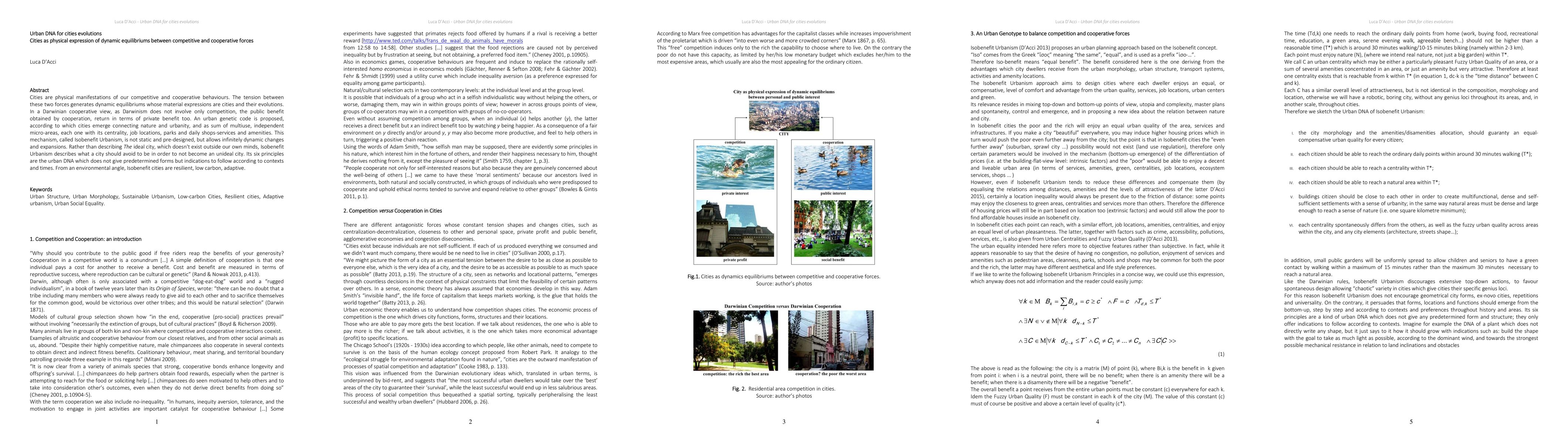 Cities are physical manifestations of our competitive and cooperative behaviours. The tension between these two forces generates dynamic equilibriums whose material expressions are cities and their evolutions. In a Darwinian cooperative view, as Darwinism does not involve only competition, the public benefit obtained by cooperation, return in terms of private benefit too. An urban genetic code is proposed, according to which cities emerge connecting nature and urbanity, and as sum of multiuse, independent micro-areas, each one with its centrality, job locations, parks and daily shops-services and amenities. This mechanism, called Isobenefit Urbanism, is not static and pre-designed, but allows infinitely dynamic changes and expansions. Rather than describing The ideal city, which doesn't exist outside our own minds, Isobenefit Urbanism describes what a city should avoid to be in order to not become an unideal city. Its six principles are the urban DNA which does not give predetermined forms but indications to follow according to contexts and times. From an environmental angle, Isobenefit cities are resilient, low carbon, adaptive.