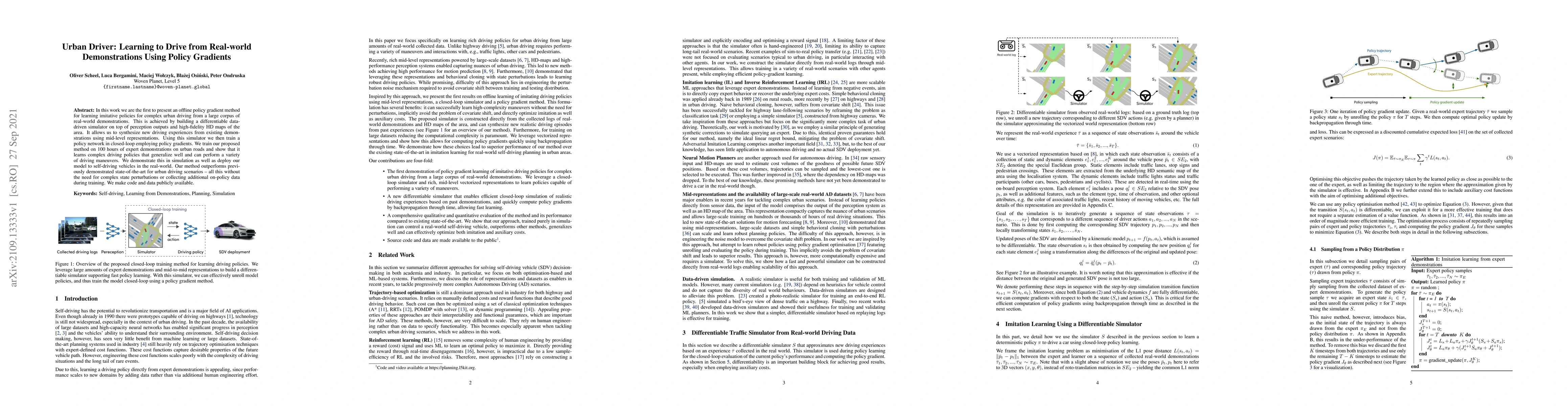 This paper presents an offline policy gradient method for learning imitative urban driving policies from real-world demonstrations, utilizing a differentiable simulator and high-fidelity maps. The method outperforms previous state-of-the-art without requiring additional on-policy data.
