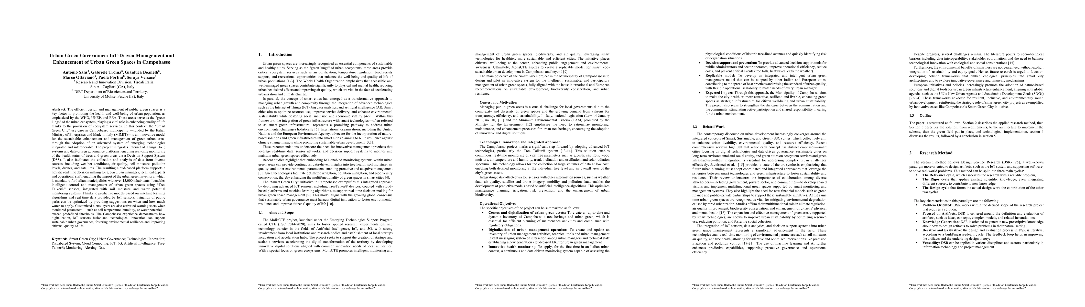 The efficient design and management of public green spaces is a key factor in promoting the health and well-being of urban population, as emphasized by the WHO, UNEP, and EEA. These areas serve as the "green lungs" of the urban ecosystem, playing a vital role in enhancing quality of life thanks to the provision of ecosystem services. In this context, the Smart Green City use case in Campobasso municipality, funded by the Italian Ministry of Enterprises (MIMIT), emerges as an innovative model for the sustainable management of green urban areas through the adoption of an advanced system of emerging technologies integrated and interoperable. The project integrates IoT systems and data-driven governance platforms, enabling real-time monitoring of the health status of trees and green areas via a Decision Support System (DSS). It also facilitates the collection and analysis of data from diverse sources, including weather conditions, air quality, soil moisture, pollution levels. The resulting cloud-based platform supports a holistic real time decision making for green urban managers, technical experts and operational staff. It enables intelligent control and management of urban green spaces using Tree Talker sensors, integrated with soil moisture and water potential monitoring systems. Thanks to predictive models based on machine learning algorithms and real time data provided by IoT sensors, irrigation of public parks can be optimized by providing suggestions on when and how much water to apply. Customized alerts layers are also activated warning users when monitored parameters, such as soil temperature, humidity, or water potential, exceed predefined thresholds. This Use Case demonstrates how digitalization, IoT sensors fusion and technological innovation can support sustainable urban governance, fostering environmental resilience and improving citizens quality of life.