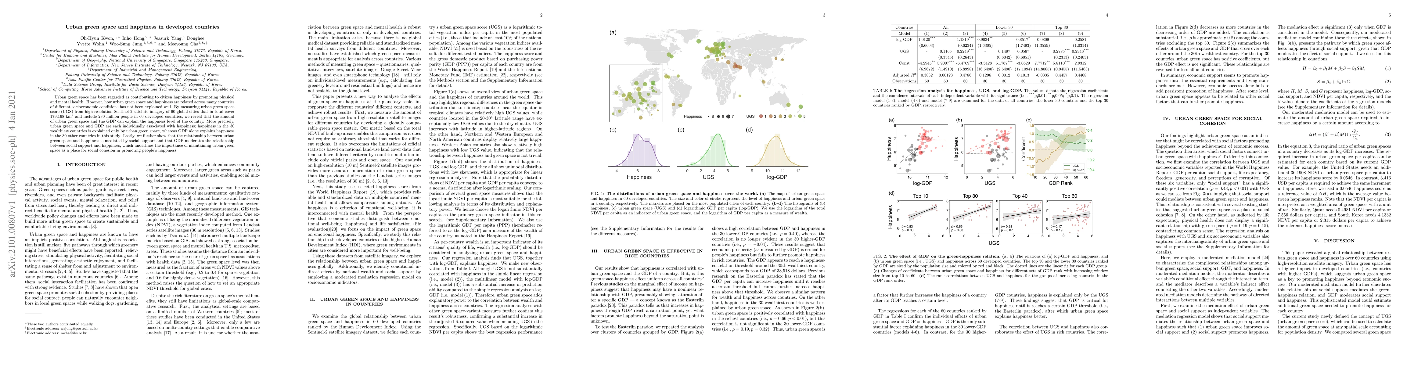 This study finds that urban green space and GDP are significant predictors of happiness across developed countries, with green space being crucial for the wealthiest nations and GDP for others. The study also highlights that urban green space fosters happiness through social support, emphasizing the importance of green spaces for social cohesion.