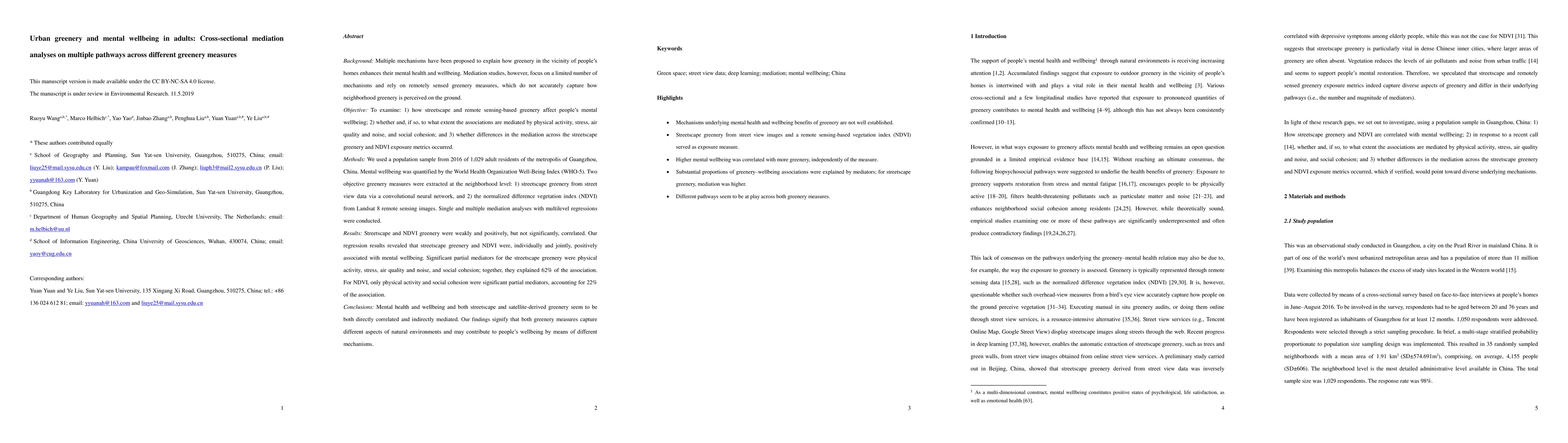 Multiple mechanisms have been proposed to explain how greenery enhances their mental wellbeing. Mediation studies, however, focus on a limited number of mechanisms and rely on remotely sensed greenery measures, which do not accurately capture how neighborhood greenery is perceived on the ground. To examine: 1) how streetscape and remote sensing-based greenery affect people's mental wellbeing in Guangzhou, China; 2) whether and, if so, to what extent the associations are mediated by physical activity, stress, air quality and noise, and social cohesion; and 3) whether differences in the mediation across the streetscape greenery and NDVI exposure metrics occurred. Mental wellbeing was quantified by the WHO-5 wellbeing index. Greenery measures were extracted at the neighborhood level: 1) streetscape greenery from street view data via a convolutional neural network, and 2) the NDVI remote sensing images. Single and multiple mediation analyses with multilevel regressions were conducted. Streetscape and NDVI greenery were weakly and positively, but not significantly, correlated. Our regression results revealed that streetscape greenery and NDVI were, individually and jointly, positively associated with mental wellbeing. Significant partial mediators for the streetscape greenery were physical activity, stress, air quality and noise, and social cohesion; together, they explained 62% of the association. For NDVI, only physical activity and social cohesion were significant partial mediators, accounting for 22% of the association. Mental health and wellbeing and both streetscape and satellite-derived greenery seem to be both directly correlated and indirectly mediated. Our findings signify that both greenery measures capture different aspects of natural environments and may contribute to people's wellbeing by means of different mechanisms.