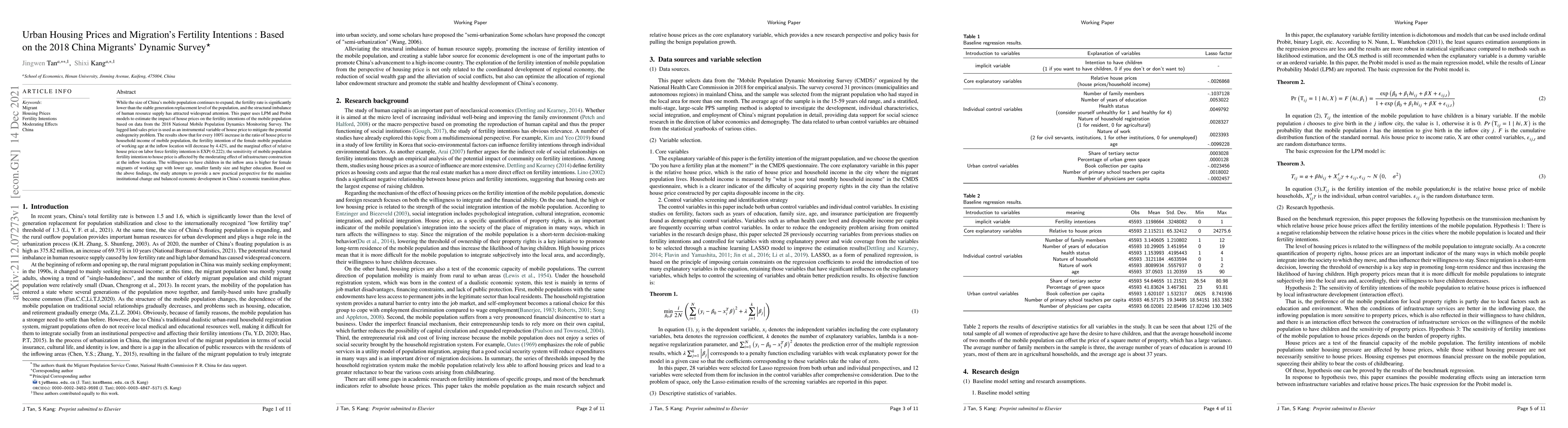 This study uses 2018 China Migrants' Dynamic Survey data to show that higher house prices relative to income negatively impact fertility intentions of female mobile population at inflow locations. The research employs LPM and Probit models with instrumental variables to address endogeneity, finding a 4.42% decrease in fertility intention for each 100% increase in the house price to income ratio. Fertility intention is also influenced by factors like age, family size, education, and infrastructure at the inflow location.