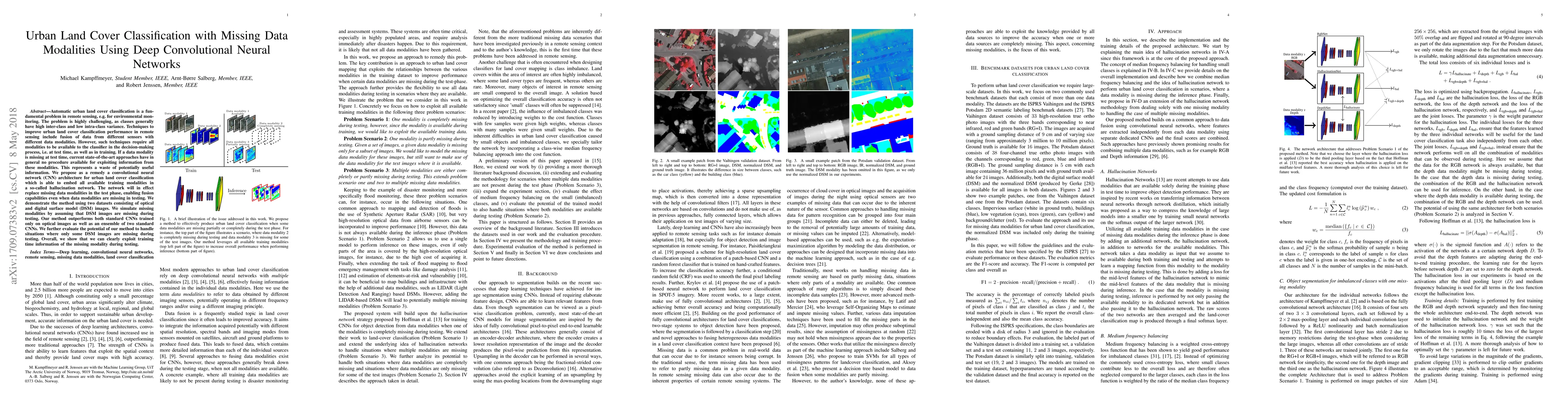 This paper proposes a deep convolutional neural network (CNN) architecture to improve urban land cover classification by embedding available training modalities into a hallucination network, which can replace missing data during testing. The method outperforms standard CNNs and ensembles, demonstrating effective exploitation of training data to handle missing modalities during testing.