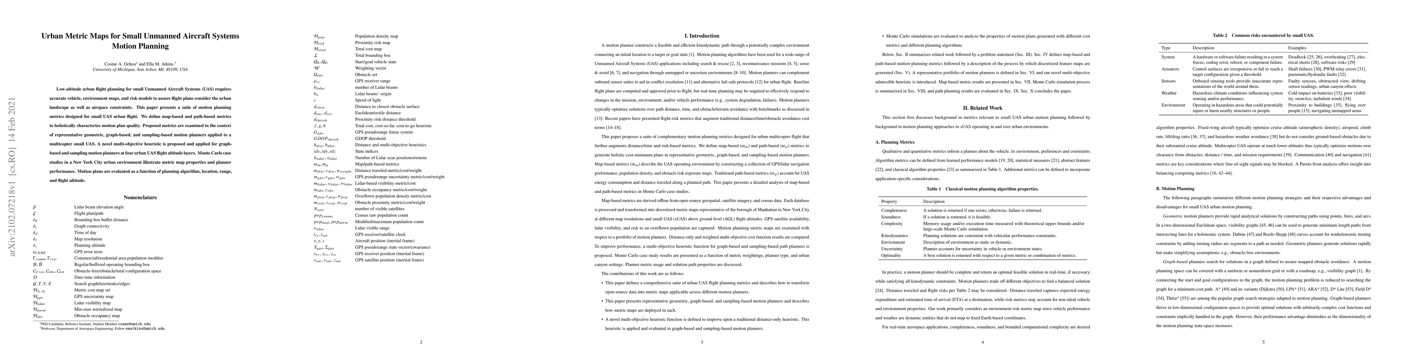 Low-altitude urban flight planning for small Unmanned Aircraft Systems (UAS) requires accurate vehicle, environment maps, and risk models to assure flight plans consider the urban landscape as well as airspace constraints. This paper presents a suite of motion planning metrics designed for small UAS urban flight. We define map-based and path-based metrics to holistically characterize motion plan quality. Proposed metrics are examined in the context of representative geometric, graph-based, and sampling-based motion planners applied to a multicopter small UAS. A novel multi-objective heuristic is proposed and applied for graph-based and sampling motion planners at four urban UAS flight altitude layers. Monte Carlo case studies in a New York City urban environment illustrate metric map properties and planner performance. Motion plans are evaluated as a function of planning algorithm, location, range, and flight altitude.