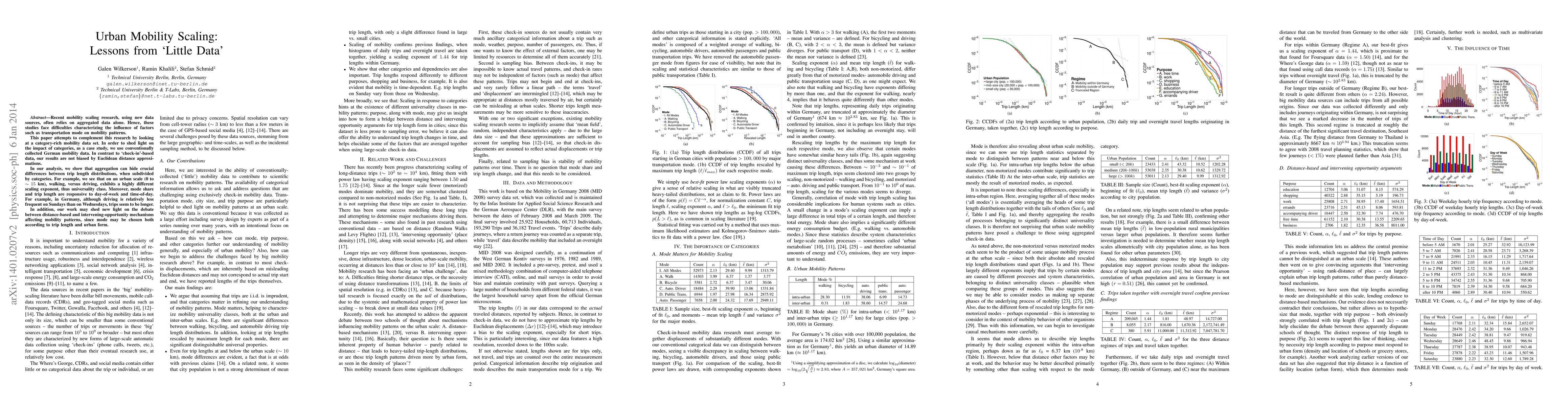 Recent mobility scaling research, using new data sources, often relies on aggregated data alone. Hence, these studies face difficulties characterizing the influence of factors such as transportation mode on mobility patterns. This paper attempts to complement this research by looking at a category-rich mobility data set. In order to shed light on the impact of categories, as a case study, we use conventionally collected German mobility data. In contrast to `check-in'-based data, our results are not biased by Euclidean distance approximations. In our analysis, we show that aggregation can hide crucial differences between trip length distributions, when subdivided by categories. For example, we see that on an urban scale (0 to ~15 km), walking, versus driving, exhibits a highly different scaling exponent, thus universality class. Moreover, mode share and trip length are responsive to day-of-week and time-of-day. For example, in Germany, although driving is relatively less frequent on Sundays than on Wednesdays, trips seem to be longer. In addition, our work may shed new light on the debate between distance-based and intervening-opportunity mechanisms affecting mobility patterns, since mode may be chosen both according to trip length and urban form.
