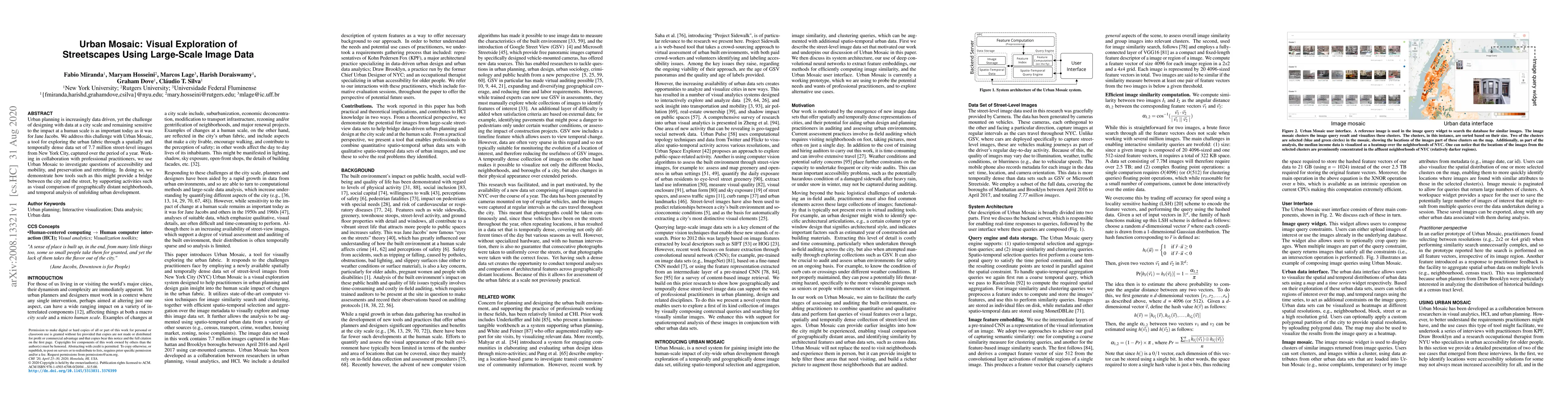 Urban Mosaic is a tool for exploring urban fabric using 7.7 million street-level images from New York City, aiding urban planning through spatial and temporal analysis of accessibility, mobility, and urban development. It bridges city-scale data with human-scale impact considerations.