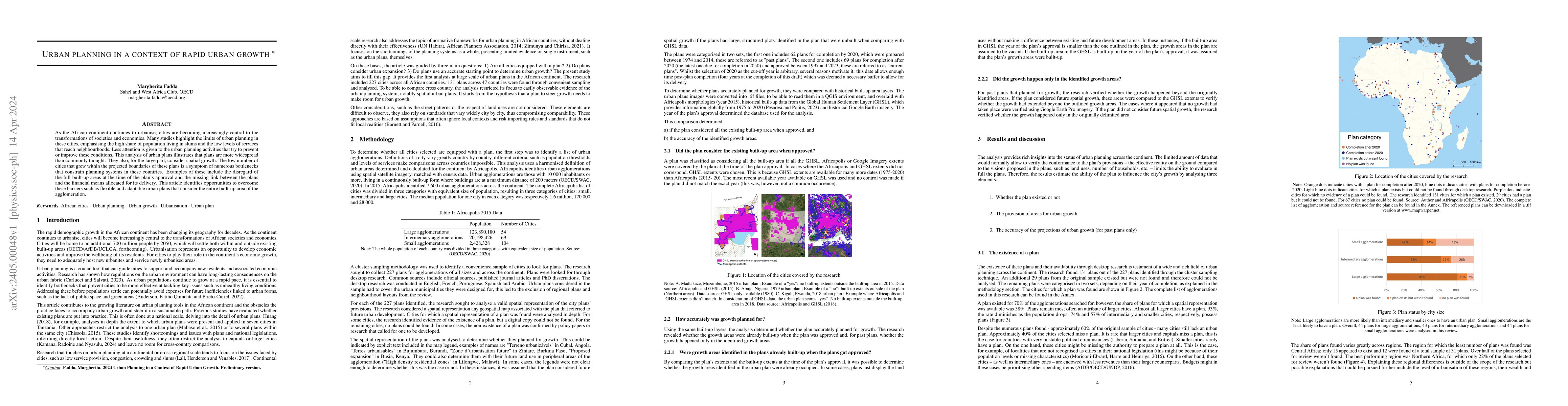 As the African continent continues to urbanise, cities are becoming increasingly central to the transformations of societies and economies. Many studies highlight the limits of urban planning in these cities, emphasising the high share of population living in slums and the low levels of services that reach neighbourhoods. Less attention is given to the urban planning activities that try to prevent or improve these conditions. This analysis of urban plans illustrates that plans are more widespread than commonly thought. They also, for the large part, consider spatial growth. The low number of cities that grew within the projected boundaries of these plans is a symptom of numerous bottlenecks that constrain planning systems in these countries. Examples of these include the disregard of the full built-up areas at the time of the plan's approval and the missing link between the plans and the financial means allocated for its delivery. This article identifies opportunities to overcome these barriers such as flexible and adaptable urban plans that consider the entire built-up area of the agglomeration.