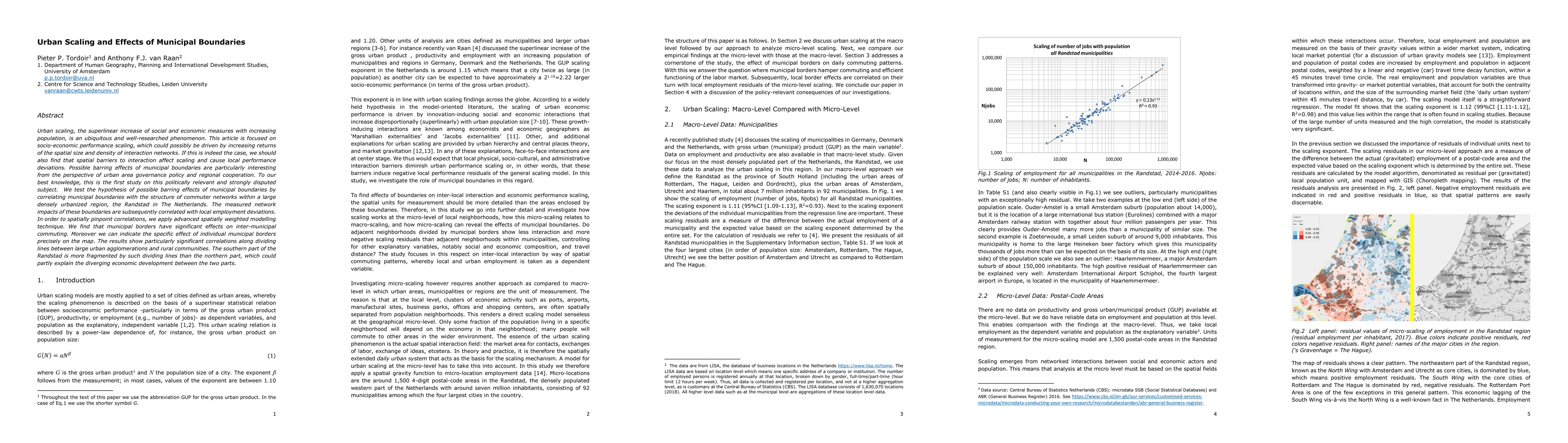 This study investigates urban scaling and the impact of municipal boundaries on socio-economic performance in the Randstad region of the Netherlands. It finds significant effects of municipal borders on inter-municipal commuting, with particularly strong correlations along the dividing lines between large urban areas and rural communities, potentially explaining economic development disparities.