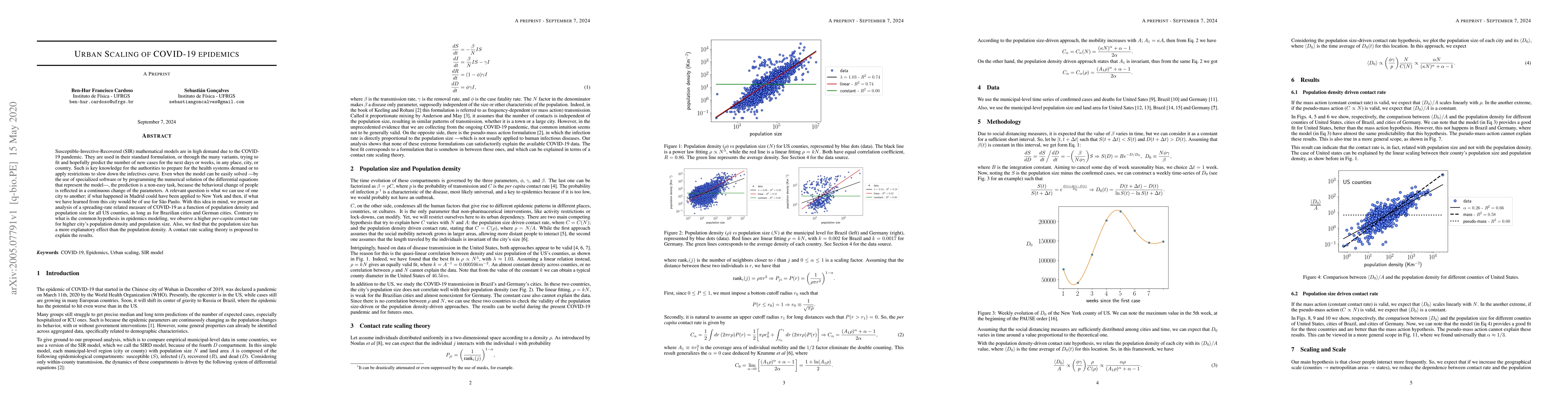 Susceptible-Invective-Recovered (SIR) mathematical models are in high demand due to the COVID-19 pandemic. They are used in their standard formulation, or through the many variants, trying to fit and hopefully predict the number of new cases for the next days or weeks, in any place, city, or country. Such is key knowledge for the authorities to prepare for the health systems demand or to apply restrictions to slow down the infectives curve. Even when the model can be easily solved ---by the use of specialized software or by programming the numerical solution of the differential equations that represent the model---, the prediction is a non-easy task, because the behavioral change of people is reflected in a continuous change of the parameters. A relevant question is what we can use of one city to another; if what happened in Madrid could have been applied to New York and then, if what we have learned from this city would be of use for S\~ao Paulo. With this idea in mind, we present an analysis of a spreading-rate related measure of COVID-19 as a function of population density and population size for all US counties, as long as for Brazilian cities and German cities. Contrary to what is the common hypothesis in epidemics modeling, we observe a higher {\em per-capita} contact rate for higher city's population density and population size. Also, we find that the population size has a more explanatory effect than the population density. A contact rate scaling theory is proposed to explain the results.