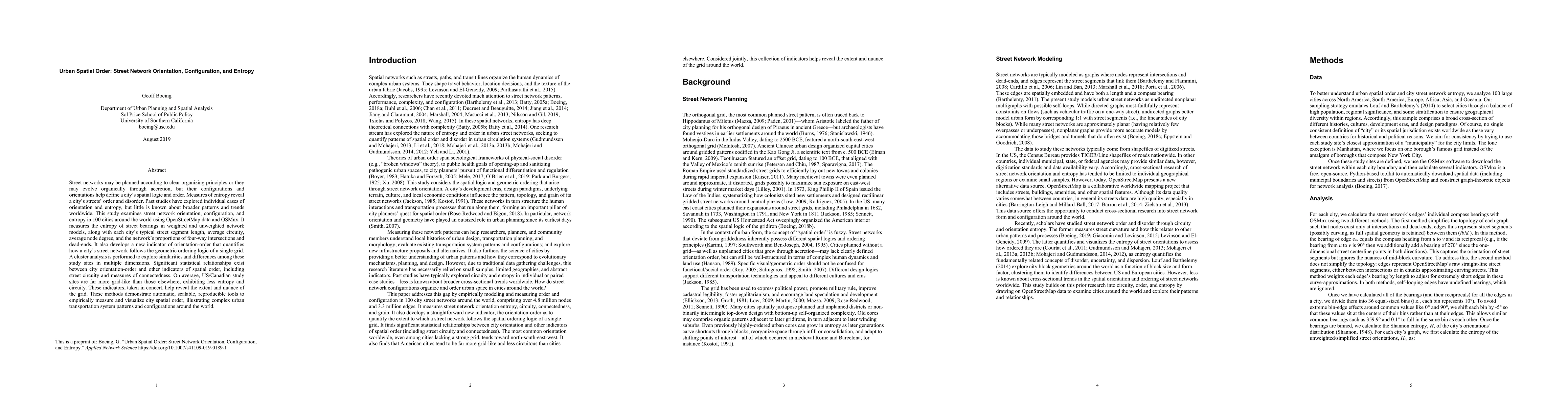 This study analyzes street network orientation, configuration, and entropy in 100 global cities using OpenStreetMap data. Key findings include significant relationships between city orientation-order and other spatial order indicators, revealing US/Canadian cities are more grid-like with less entropy and circuity. The research introduces automatic, scalable tools to empirically measure and visualize urban spatial order patterns.