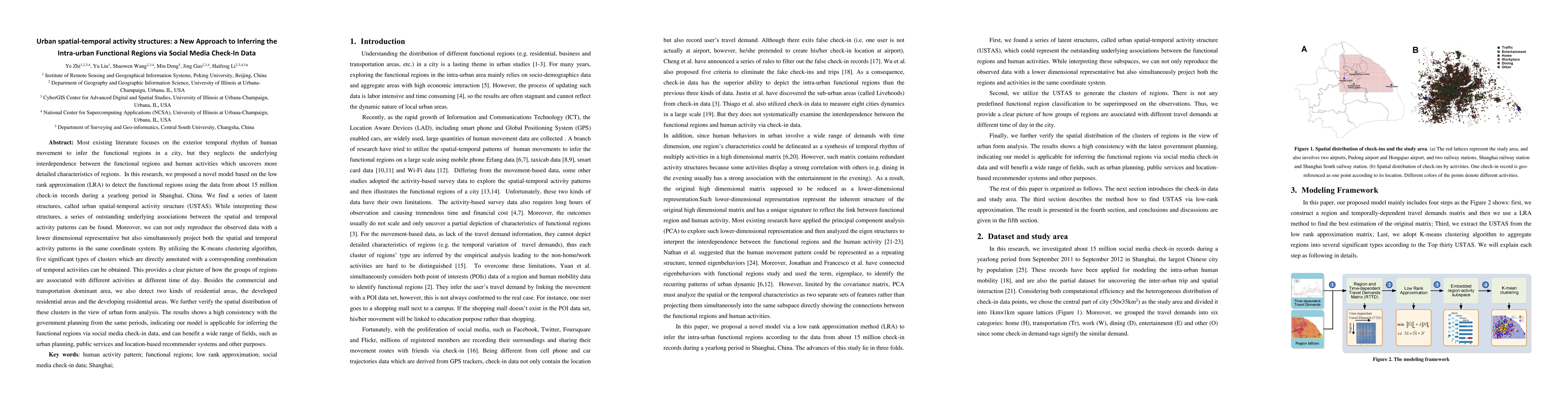 Most existing literature focuses on the exterior temporal rhythm of human movement to infer the functional regions in a city, but they neglects the underlying interdependence between the functional regions and human activities which uncovers more detailed characteristics of regions. In this research, we proposed a novel model based on the low rank approximation (LRA) to detect the functional regions using the data from about 15 million check-in records during a yearlong period in Shanghai, China. We find a series of latent structures, called urban spatial-temporal activity structure (USTAS). While interpreting these structures, a series of outstanding underlying associations between the spatial and temporal activity patterns can be found. Moreover, we can not only reproduce the observed data with a lower dimensional representative but also simultaneously project both the spatial and temporal activity patterns in the same coordinate system. By utilizing the K-means clustering algorithm, five significant types of clusters which are directly annotated with a corresponding combination of temporal activities can be obtained. This provides a clear picture of how the groups of regions are associated with different activities at different time of day. Besides the commercial and transportation dominant area, we also detect two kinds of residential areas, the developed residential areas and the developing residential areas. We further verify the spatial distribution of these clusters in the view of urban form analysis. The results shows a high consistency with the government planning from the same periods, indicating our model is applicable for inferring the functional regions via social media check-in data, and can benefit a wide range of fields, such as urban planning, public services and location-based recommender systems and other purposes.