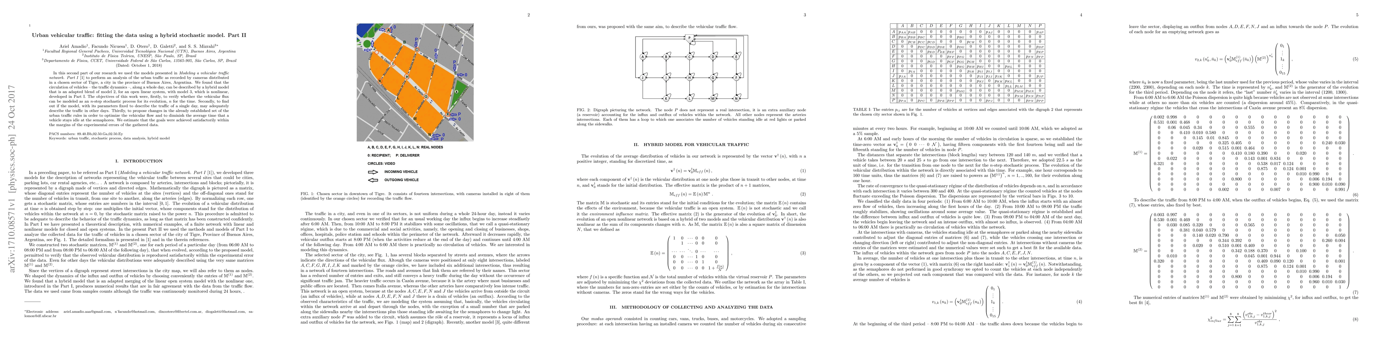 In this second part of our research we used the models presented in \emph{Modeling a vehicular traffic network. Part I} \cite{ogm1} to perform an analysis of the urban traffic as recorded by cameras distributed in a chosen sector of Tigre, a city in the province of Buenos Aires, Argentina. We found that the circulation of vehicles -- the traffic dynamics --, along a whole day, can be described by a hybrid model that is an adapted blend of model 2, for an open linear system, with model 3, which is nonlinear, developed in Part I. The objectives of this work were, firstly, to verify whether the vehicular flux can be modeled as an $n$-step stochastic process for its evolution, $n$ for the time. Secondly, to find out if the model, with its parameters fixed to describe the traffic of a single day, may adequately describe the traffic in other days. Thirdly, to propose changes in the already established set of the urban traffic rules in order to optimize the vehicular flow and to diminish the average time that a vehicle stays idle at the semaphores. We estimate that the goals were achieved satisfactorily within the margins of the experimental errors of the gathered data.
