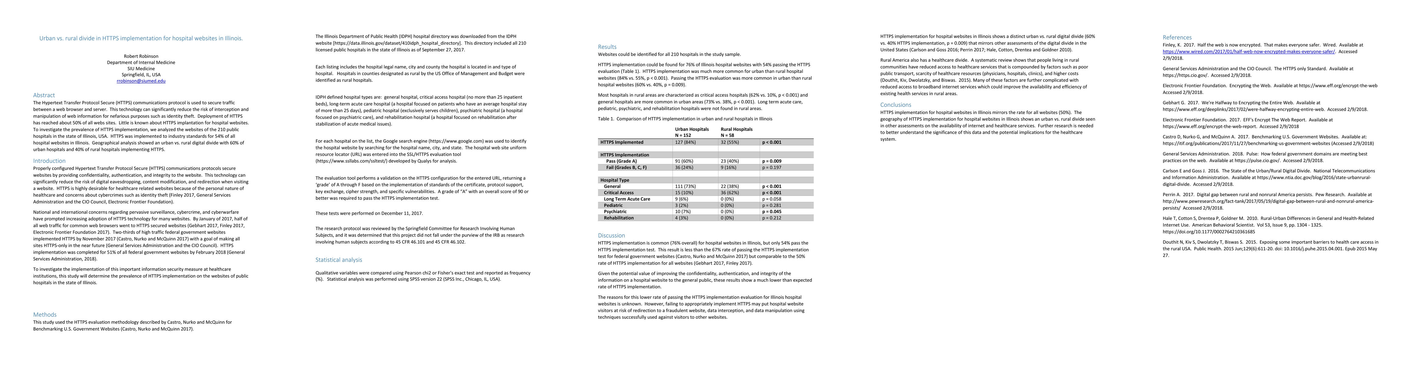 This paper investigates the prevalence of HTTPS implementation among public hospital websites in Illinois, finding that 54% of these sites use HTTPS. The study reveals a significant urban-rural digital divide, with 60% of urban hospitals adopting HTTPS compared to 40% of rural hospitals.