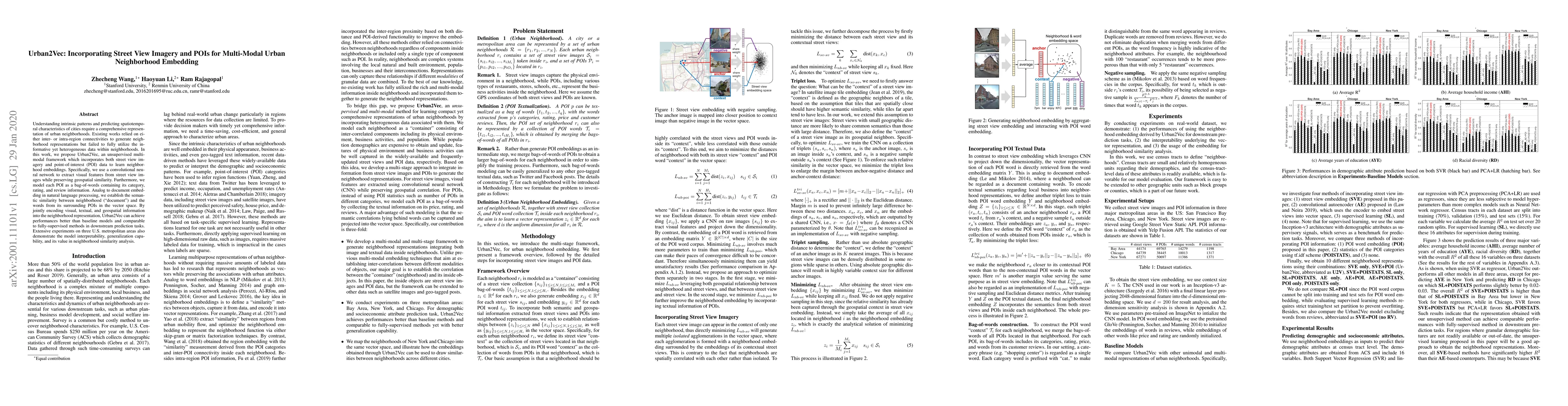 Urban2Vec is an unsupervised multi-modal framework that integrates street view imagery and POI data to create neighborhood embeddings, outperforming baseline models in urban analysis tasks. It uses CNNs for visual feature extraction and models POIs as semantic "words" to capture rich contextual information.