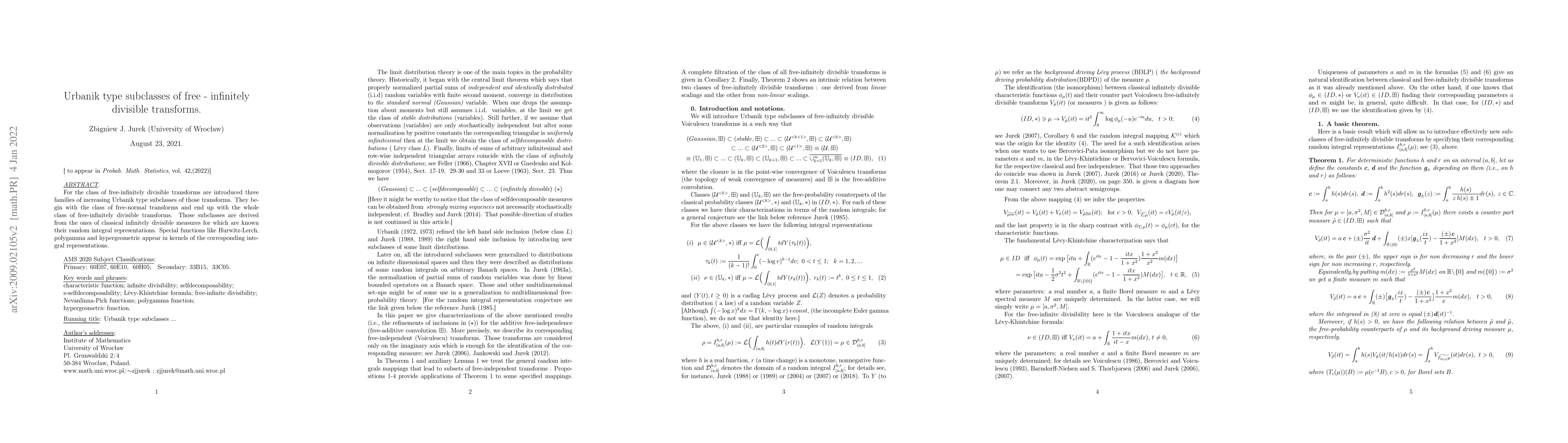 For the class of free-infinitely divisible transforms are introduced three families of increasing Urbanik type subclasses of those transforms. They begin with the class of free-normal transforms and end up with the whole class of free-infinitely divisible transforms. Those subclasses are derived from the ones of classical infinitely divisible measures for which are known their random integral representations. Special functions like Hurwitz-Lerch, polygamma and hypergeometric appeared in kernels of the corresponding integral representations.