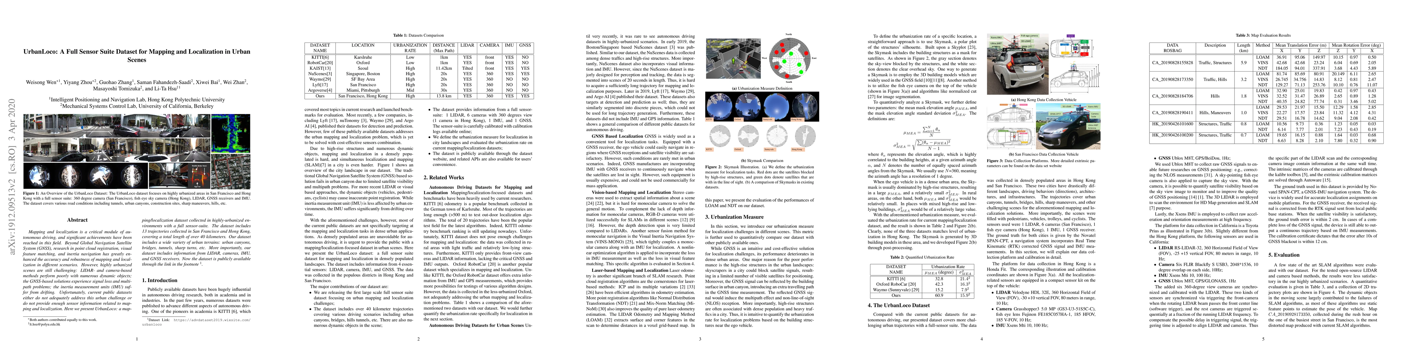 UrbanLoco is a comprehensive dataset for urban mapping and localization, featuring 13 trajectories in San Francisco and Hong Kong with data from LIDAR, cameras, IMU, and GNSS. It aims to address the challenges of localization in highly urbanized environments.