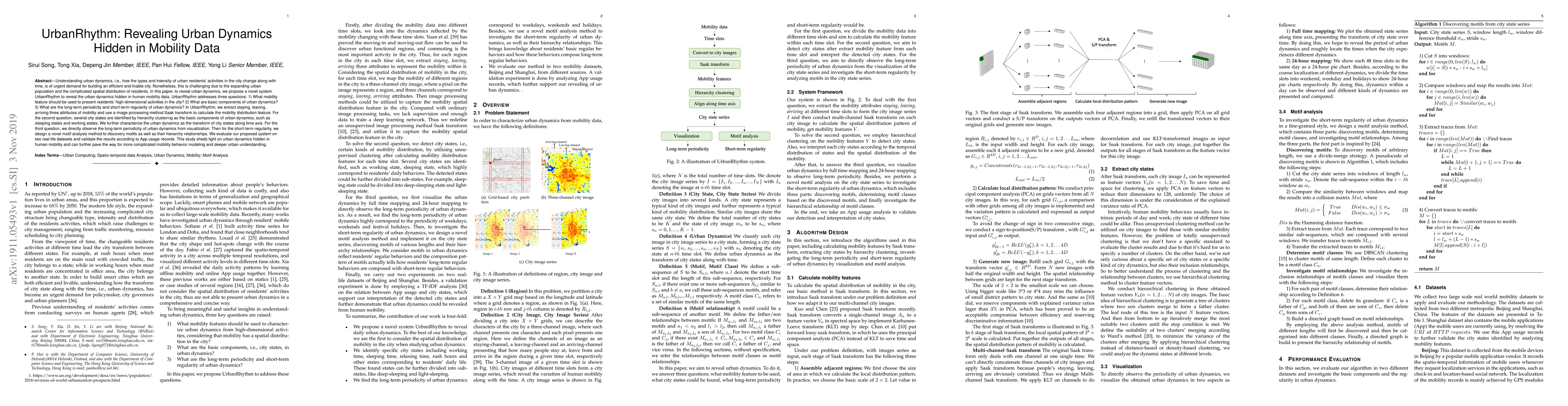 UrbanRhythm proposes a system to uncover urban dynamics from human mobility data, addressing key questions about mobility features, city states, and periodicity/regularity. The system uses Saak transform and motif analysis to identify basic components and temporal patterns of urban activities.