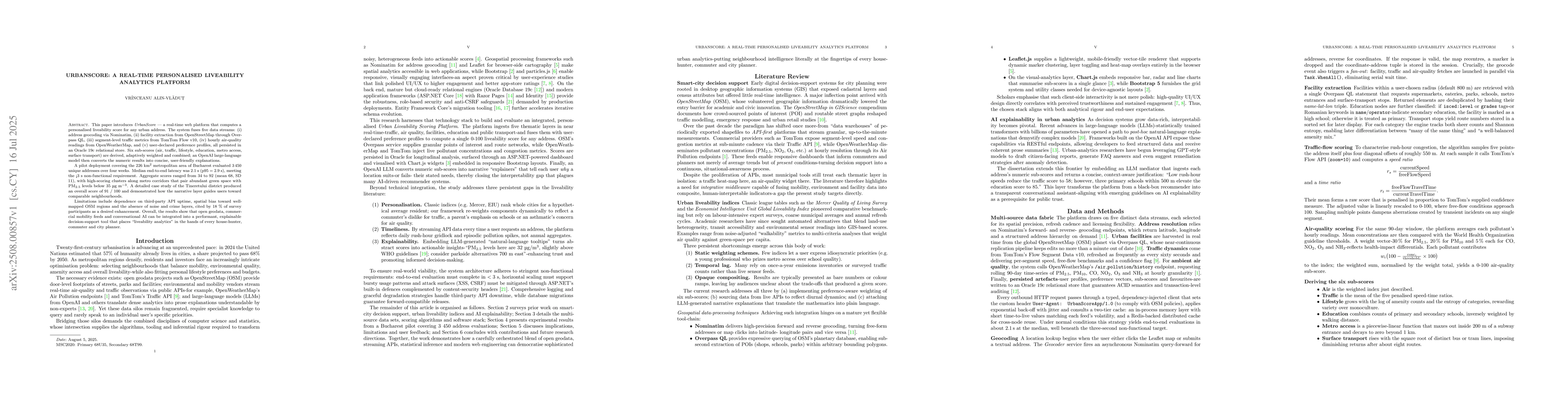 This paper introduces UrbanScore - a real-time web platform that computes a personalised liveability score for any urban address. The system fuses five data streams: (i) address geocoding via Nominatim, (ii) facility extraction from OpenStreetMap through Overpass QL, (iii) segment-level traffic metrics from TomTom Flow v10, (iv) hourly air-quality readings from OpenWeatherMap, and (v) user-declared preference profiles, all persisted in an Oracle 19c relational store. Six sub-scores (air, traffic, lifestyle, education, metro access, surface transport) are derived, adaptively weighted and combined; an OpenAI large-language model then converts the numeric results into concise, user-friendly explanations. A pilot deployment covering the 226 km2 metropolitan area of Bucharest evaluated 3,450 unique addresses over four weeks. Median end-to-end latency was 2.1 s (p95 = 2.9s), meeting the <3 non-functional requirement. Aggregate scores ranged from 34 to 92 (mean 68, SD 11), with high-scoring clusters along metro corridors that pair abundant green space with PM2.5 levels below 35 ug m-3. A detailed case study of the Tineretului district produced an overall score of 91/100 and demonstrated how the narrative layer guides users toward comparable neighbourhoods. Limitations include dependence on third-party API uptime, spatial bias toward well-mapped OSM regions and the absence of noise and crime layers, cited by 18% of survey participants as a desired enhancement. Overall, the results show that open geodata, commercial mobility feeds and conversational AI can be integrated into a performant, explainable decision-support tool that places "liveability analytics" in the hands of every house-hunter, commuter and city planner.