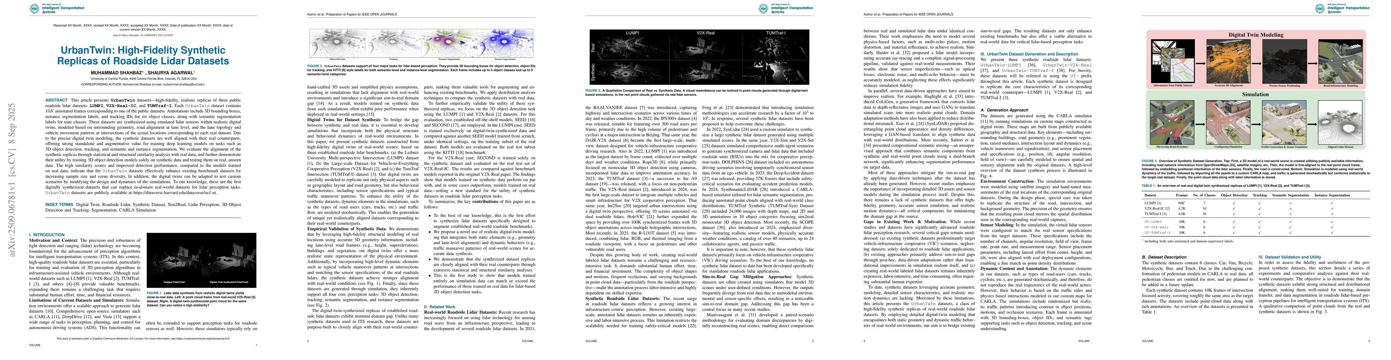 This article presents UrbanTwin datasets - high-fidelity, realistic replicas of three public roadside lidar datasets: LUMPI, V2X-Real-IC, and TUMTraf-I. Each UrbanTwin dataset contains 10K annotated frames corresponding to one of the public datasets. Annotations include 3D bounding boxes, instance segmentation labels, and tracking IDs for six object classes, along with semantic segmentation labels for nine classes. These datasets are synthesized using emulated lidar sensors within realistic digital twins, modeled based on surrounding geometry, road alignment at lane level, and the lane topology and vehicle movement patterns at intersections of the actual locations corresponding to each real dataset. Due to the precise digital twin modeling, the synthetic datasets are well aligned with their real counterparts, offering strong standalone and augmentative value for training deep learning models on tasks such as 3D object detection, tracking, and semantic and instance segmentation. We evaluate the alignment of the synthetic replicas through statistical and structural similarity analysis with real data, and further demonstrate their utility by training 3D object detection models solely on synthetic data and testing them on real, unseen data. The high similarity scores and improved detection performance, compared to the models trained on real data, indicate that the UrbanTwin datasets effectively enhance existing benchmark datasets by increasing sample size and scene diversity. In addition, the digital twins can be adapted to test custom scenarios by modifying the design and dynamics of the simulations. To our knowledge, these are the first digitally synthesized datasets that can replace in-domain real-world datasets for lidar perception tasks. UrbanTwin datasets are publicly available at https://dataverse.harvard.edu/dataverse/ucf-ut.