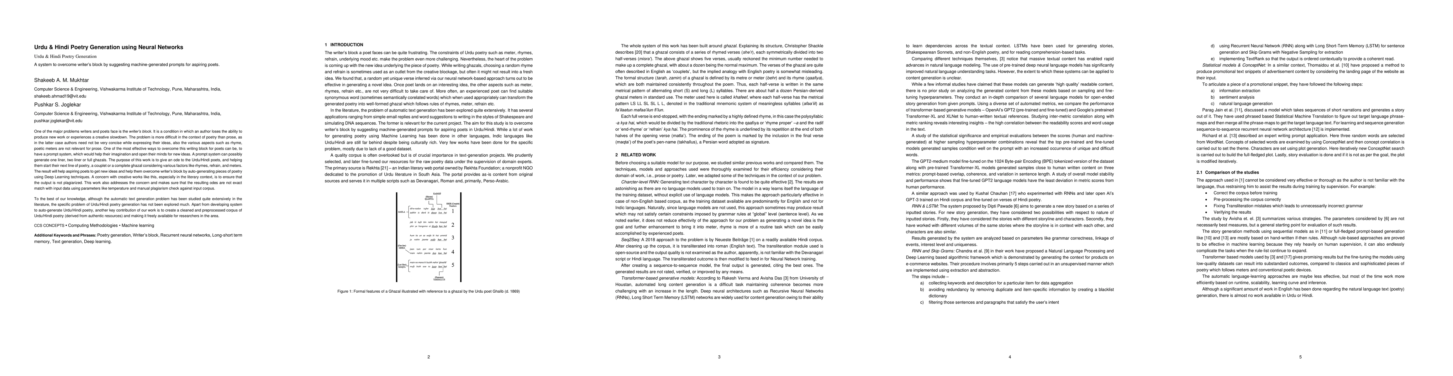 This paper explores the use of neural networks to generate Urdu and Hindi poetry, aiming to assist poets in overcoming writer's block by providing prompts that consider rhymes, refrains, and meters. It also addresses the issue of plagiarism in creative outputs by ensuring generated poetry is unique.