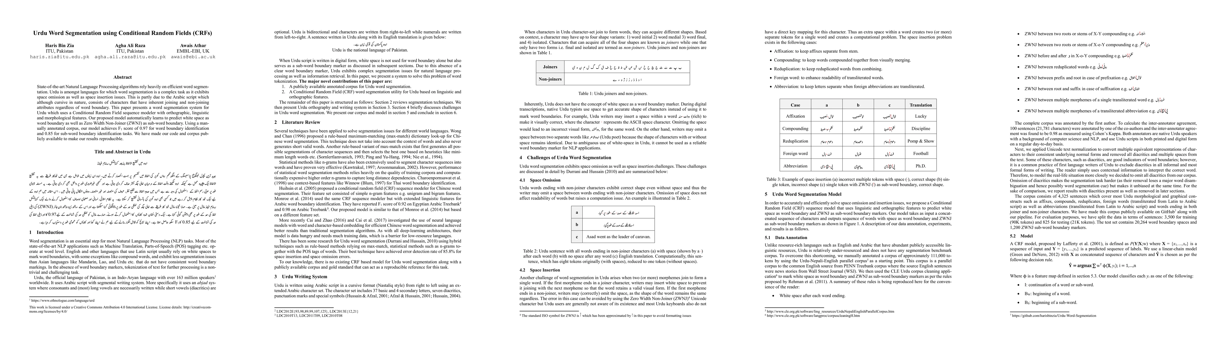 This paper proposes a Conditional Random Fields (CRF) model for Urdu word segmentation, addressing the complexities of space omission and insertion in the language. The CRF model, enhanced with orthographic, linguistic, and morphological features, achieves high F1 scores for word and sub-word boundary identification, and the authors have made their code and annotated corpus publicly available for reproducibility.