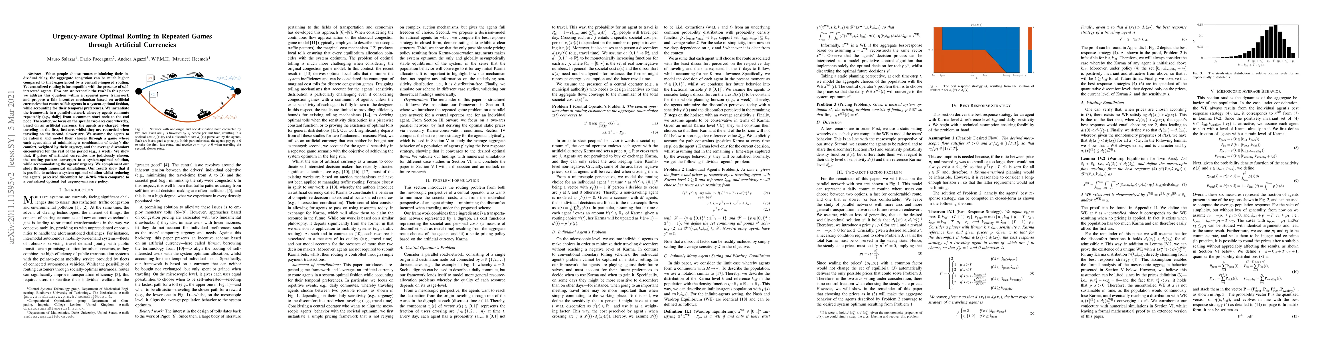 A new approach to routing in repeated games uses artificial currencies to balance individual urgency with system optimality, achieving a 14-20% reduction in perceived discomfort compared to centralized policies.