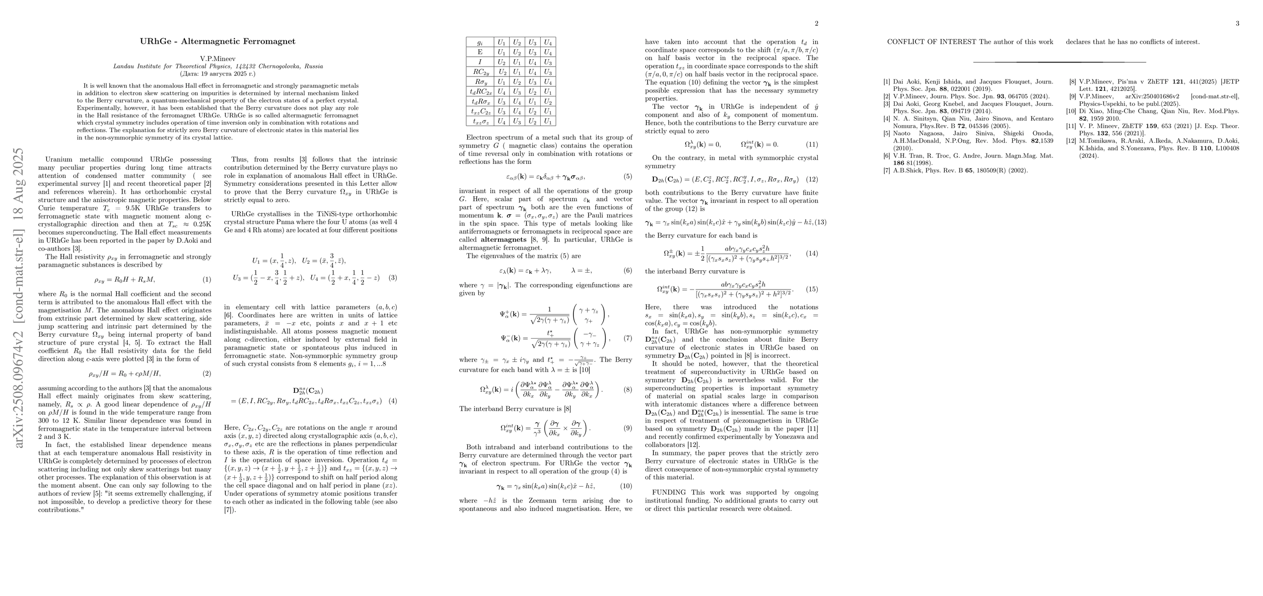 It is well known that the anomalous Hall effect in ferromagnetic and strongly paramagnetic metals in addition to electron skew scattering on impurities is determined by internal mechanism linked to the Berry curvature, a quantum-mechanical property of the electron states of a perfect crystal. Experimentally, however, it has been established that the Berry curvature does not play any role in the Hall resistance of the ferromagnet URhGe. URhGe is so called altermagnetic ferromagnet which crystal symmetry includes operation of time inversion only in combination with rotations and reflections. The explanation for strictly zero Berry curvature of electronic states in this material lies in the non-symmorphic symmetry of its crystal lattice.