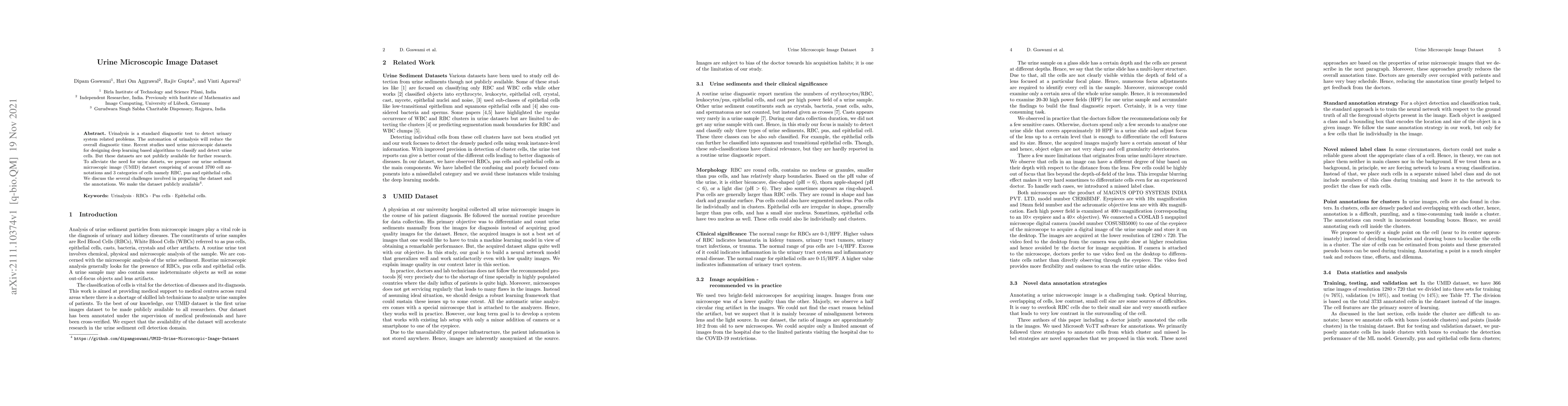 Urinalysis is a standard diagnostic test to detect urinary system related problems. The automation of urinalysis will reduce the overall diagnostic time. Recent studies used urine microscopic datasets for designing deep learning based algorithms to classify and detect urine cells. But these datasets are not publicly available for further research. To alleviate the need for urine datsets, we prepare our urine sediment microscopic image (UMID) dataset comprising of around 3700 cell annotations and 3 categories of cells namely RBC, pus and epithelial cells. We discuss the several challenges involved in preparing the dataset and the annotations. We make the dataset publicly available.