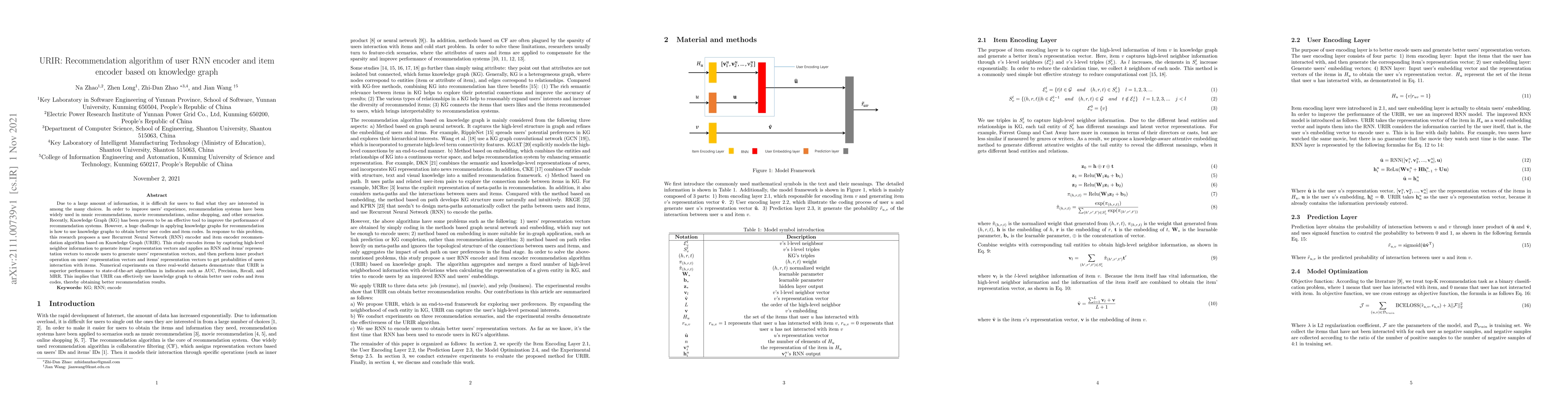 Due to a large amount of information, it is difficult for users to find what they are interested in among the many choices. In order to improve users' experience, recommendation systems have been widely used in music recommendations, movie recommendations, online shopping, and other scenarios. Recently, Knowledge Graph (KG) has been proven to be an effective tool to improve the performance of recommendation systems. However, a huge challenge in applying knowledge graphs for recommendation is how to use knowledge graphs to obtain better user codes and item codes. In response to this problem, this research proposes a user Recurrent Neural Network (RNN) encoder and item encoder recommendation algorithm based on Knowledge Graph (URIR). This study encodes items by capturing high-level neighbor information to generate items' representation vectors and applies an RNN and items' representation vectors to encode users to generate users' representation vectors, and then perform inner product operation on users' representation vectors and items' representation vectors to get probabilities of users interaction with items. Numerical experiments on three real-world datasets demonstrate that URIR is superior performance to state-of-the-art algorithms in indicators such as AUC, Precision, Recall, and MRR. This implies that URIR can effectively use knowledge graph to obtain better user codes and item codes, thereby obtaining better recommendation results.
