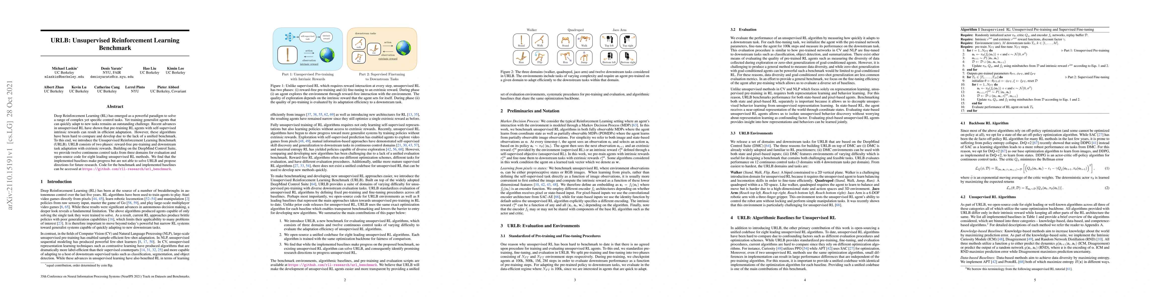 The Unsupervised Reinforcement Learning Benchmark (URLB) aims to evaluate unsupervised RL methods by providing a unified platform with twelve continuous control tasks. Despite progress, the current baselines struggle to fully adapt, highlighting the need for future research improvements.