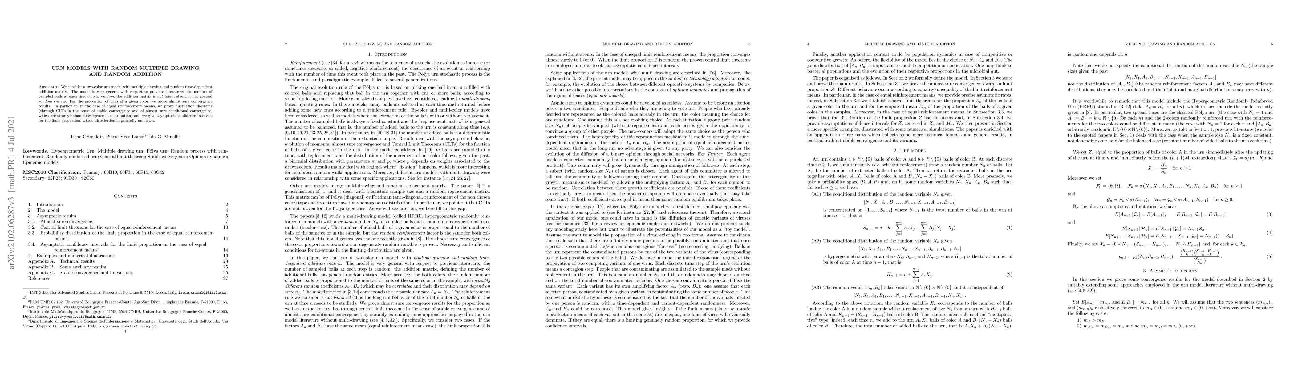 This paper studies a general urn model with random multiple draws and time-dependent random addition. It proves almost sure convergence and fluctuation theorems for the proportion of balls of a given color, providing asymptotic confidence intervals for the unknown limit distribution.