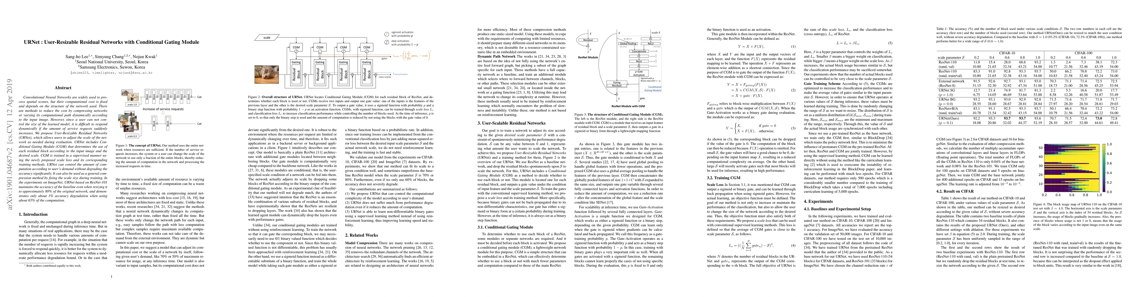 Convolutional Neural Networks are widely used to process spatial scenes, but their computational cost is fixed and depends on the structure of the network used. There are methods to reduce the cost by compressing networks or varying its computational path dynamically according to the input image. However, since a user can not control the size of the learned model, it is difficult to respond dynamically if the amount of service requests suddenly increases. We propose User-Resizable Residual Networks (URNet), which allows users to adjust the scale of the network as needed during evaluation. URNet includes Conditional Gating Module (CGM) that determines the use of each residual block according to the input image and the desired scale. CGM is trained in a supervised manner using the newly proposed scale loss and its corresponding training methods. URNet can control the amount of computation according to user's demand without degrading the accuracy significantly. It can also be used as a general compression method by fixing the scale size during training. In the experiments on ImageNet, URNet based on ResNet-101 maintains the accuracy of the baseline even when resizing it to approximately 80% of the original network, and demonstrates only about 1% accuracy degradation when using about 65% of the computation.