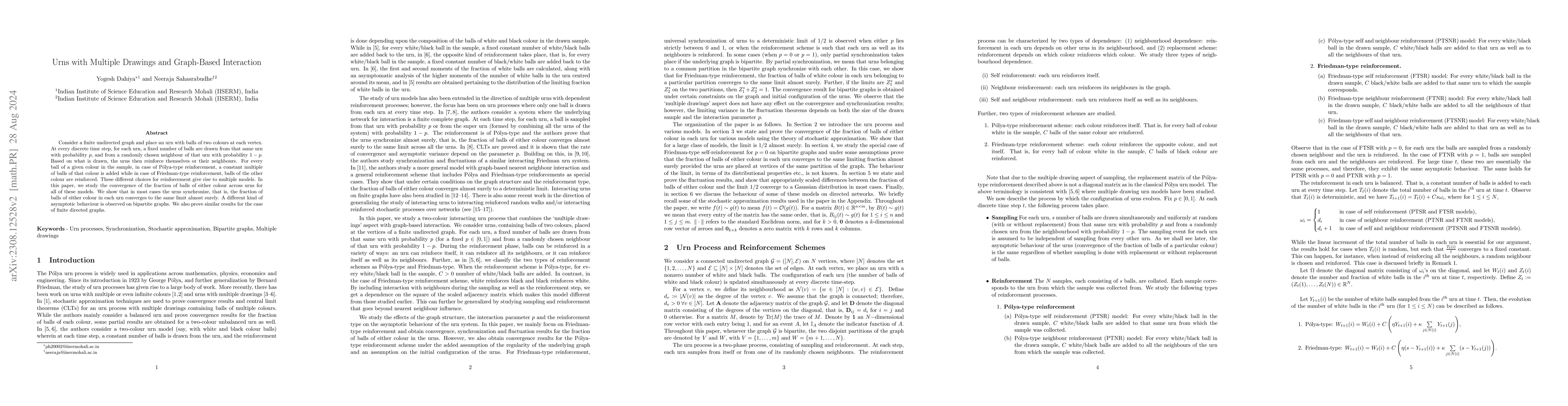 This paper explores urn models with multiple drawings on graphs where reinforcement rules determine the addition of balls based on drawn samples. It demonstrates that most models lead to synchronization of ball fractions across urns, except for bipartite graphs, and extends findings to finite directed graphs.