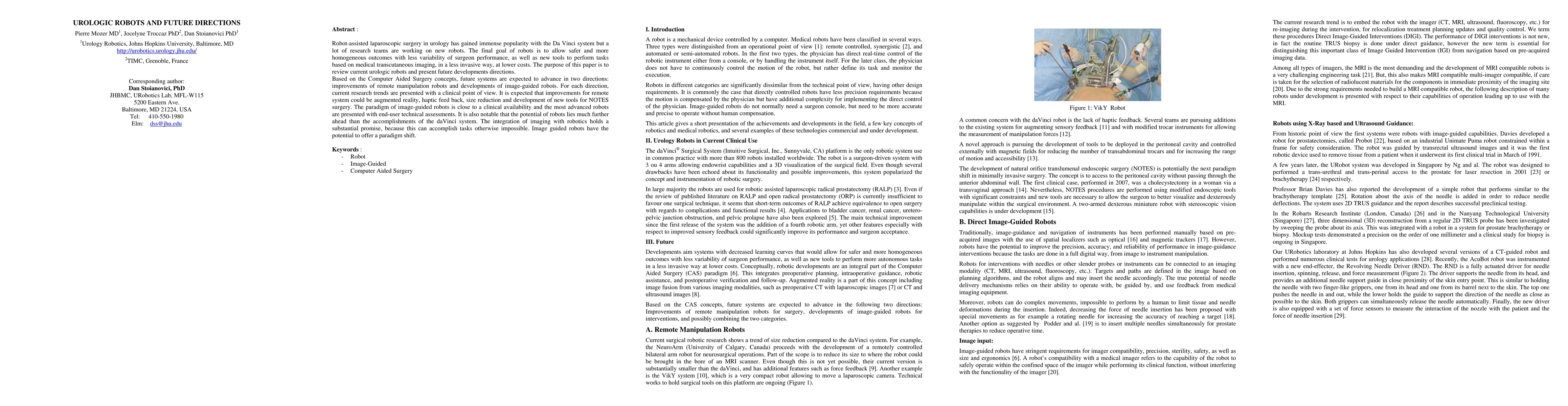 PURPOSE OF REVIEW: Robot-assisted laparoscopic surgery in urology has gained immense popularity with the daVinci system, but a lot of research teams are working on new robots. The purpose of this study is to review current urologic robots and present future development directions. RECENT FINDINGS: Future systems are expected to advance in two directions: improvements of remote manipulation robots and developments of image-guided robots. SUMMARY: The final goal of robots is to allow safer and more homogeneous outcomes with less variability of surgeon performance, as well as new tools to perform tasks on the basis of medical transcutaneous imaging, in a less invasive way, at lower costs. It is expected that improvements for a remote system could be augmented in reality, with haptic feedback, size reduction, and development of new tools for natural orifice translumenal endoscopic surgery. The paradigm of image-guided robots is close to clinical availability and the most advanced robots are presented with end-user technical assessments. It is also notable that the potential of robots lies much further ahead than the accomplishments of the daVinci system. The integration of imaging with robotics holds a substantial promise, because this can accomplish tasks otherwise impossible. Image-guided robots have the potential to offer a paradigm shift.