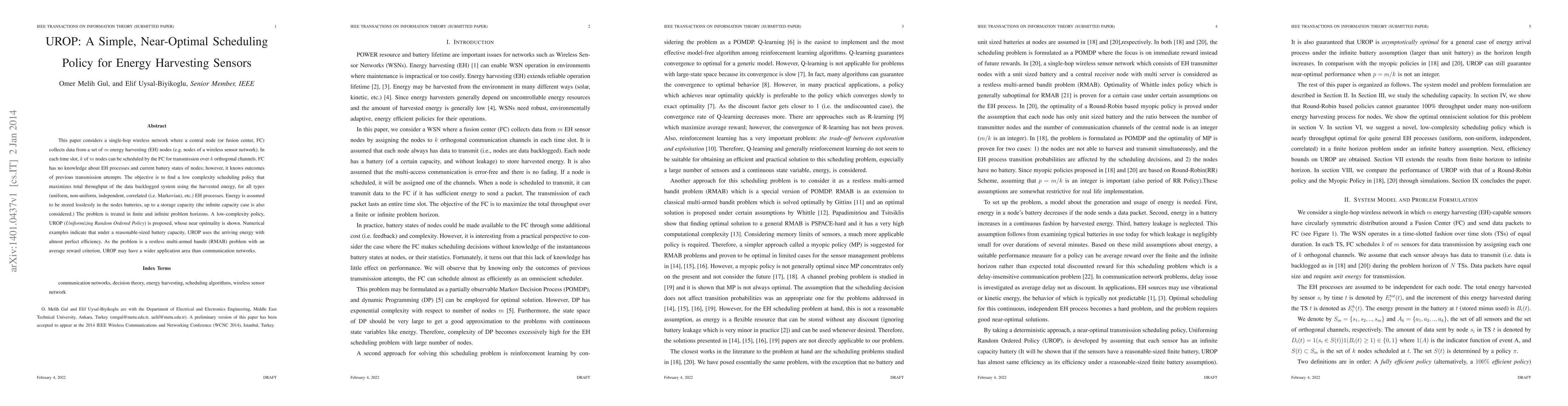 This paper considers a single-hop wireless network where a central node (or fusion center, FC) collects data from a set of m energy harvesting (EH) nodes (e.g. nodes of a wireless sensor network). In each time slot, k of m nodes can be scheduled by the FC for transmission over k orthogonal channels. FC has no knowledge about EH processes and current battery states of nodes; however, it knows outcomes of previous transmission attempts. The objective is to find a low complexity scheduling policy that maximizes total throughput of the data backlogged system using the harvested energy, for all types (uniform, non-uniform, independent, correlated (i.e. Markovian), etc.) EH processes. Energy is assumed to be stored losslessly in the nodes batteries, up to a storage capacity (the infinite capacity case is also considered.) The problem is treated in finite and infinite problem horizons. A low-complexity policy, UROP (Uniformizing Random Ordered Policy) is proposed, whose near optimality is shown. Numerical examples indicate that under a reasonable-sized battery capacity, UROP uses the arriving energy with almost perfect efficiency. As the problem is a restless multi-armed bandit (RMAB) problem with an average reward criterion, UROP may have a wider application area than communication networks.