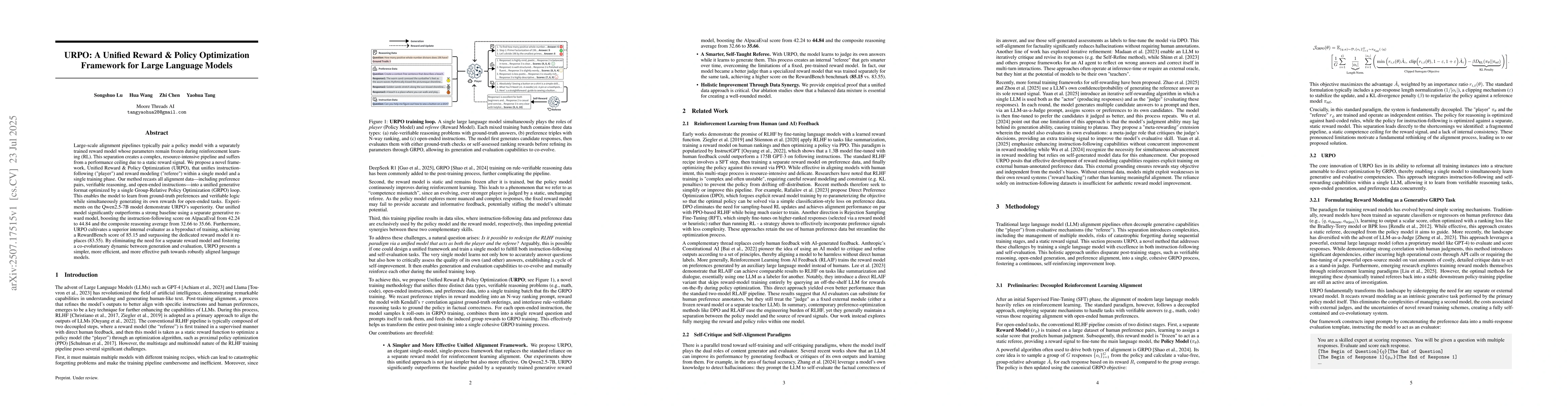 Large-scale alignment pipelines typically pair a policy model with a separately trained reward model whose parameters remain frozen during reinforcement learning (RL). This separation creates a complex, resource-intensive pipeline and suffers from a performance ceiling due to a static reward signal. We propose a novel framework, Unified Reward & Policy Optimization (URPO), that unifies instruction-following ("player") and reward modeling ("referee") within a single model and a single training phase. Our method recasts all alignment data-including preference pairs, verifiable reasoning, and open-ended instructions-into a unified generative format optimized by a single Group-Relative Policy Optimization (GRPO) loop. This enables the model to learn from ground-truth preferences and verifiable logic while simultaneously generating its own rewards for open-ended tasks. Experiments on the Qwen2.5-7B model demonstrate URPO's superiority. Our unified model significantly outperforms a strong baseline using a separate generative reward model, boosting the instruction-following score on AlpacaEval from 42.24 to 44.84 and the composite reasoning average from 32.66 to 35.66. Furthermore, URPO cultivates a superior internal evaluator as a byproduct of training, achieving a RewardBench score of 85.15 and surpassing the dedicated reward model it replaces (83.55). By eliminating the need for a separate reward model and fostering a co-evolutionary dynamic between generation and evaluation, URPO presents a simpler, more efficient, and more effective path towards robustly aligned language models.