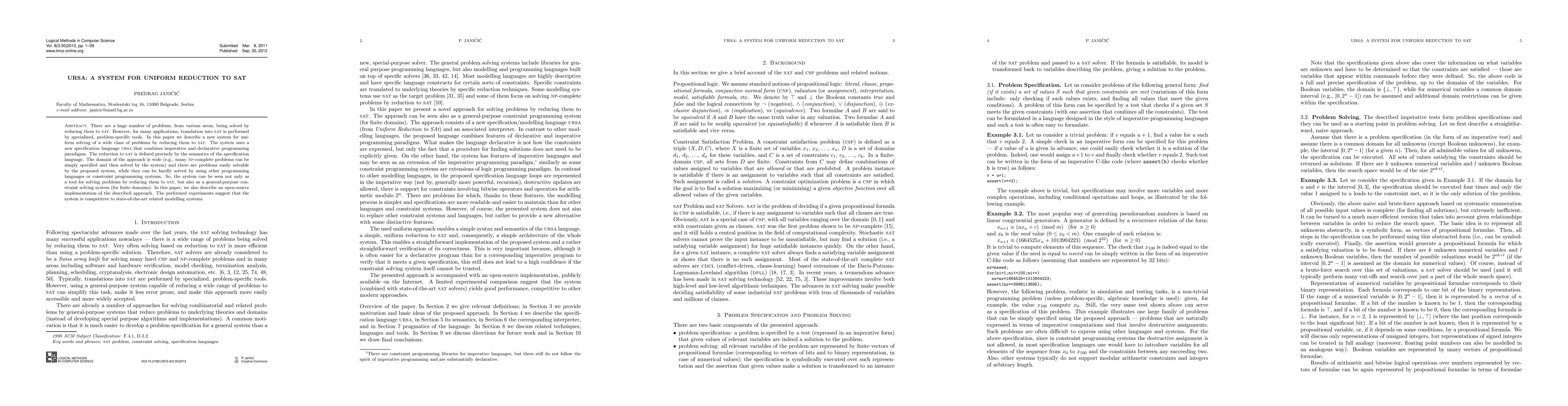 There are a huge number of problems, from various areas, being solved by reducing them to SAT. However, for many applications, translation into SAT is performed by specialized, problem-specific tools. In this paper we describe a new system for uniform solving of a wide class of problems by reducing them to SAT. The system uses a new specification language URSA that combines imperative and declarative programming paradigms. The reduction to SAT is defined precisely by the semantics of the specification language. The domain of the approach is wide (e.g., many NP-complete problems can be simply specified and then solved by the system) and there are problems easily solvable by the proposed system, while they can be hardly solved by using other programming languages or constraint programming systems. So, the system can be seen not only as a tool for solving problems by reducing them to SAT, but also as a general-purpose constraint solving system (for finite domains). In this paper, we also describe an open-source implementation of the described approach. The performed experiments suggest that the system is competitive to state-of-the-art related modelling systems.