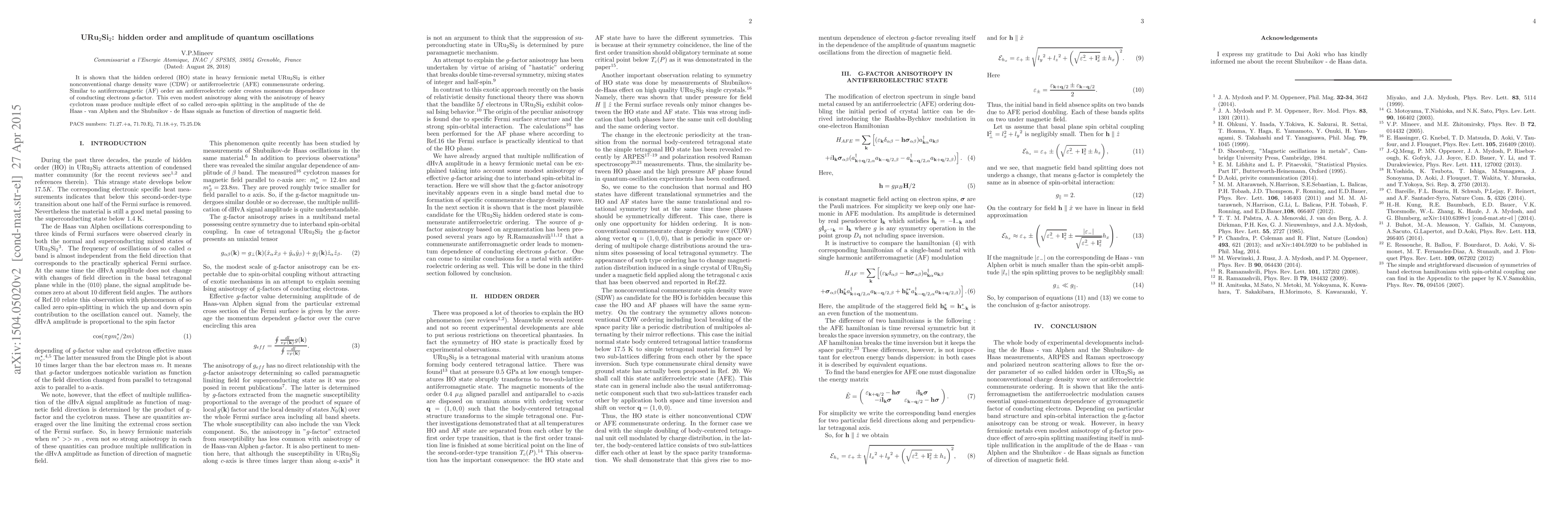 It is shown that the hidden ordered (HO) state in heavy fermionic metal URu2Si2 is either nonconventional charge density wave (CDW) or antiferroelectric (AFE) commensurate ordering. Similar to antiferromagnetic (AF) order an antiferroelectric order creates momentum dependence of conducting electrons $g$-factor. This even modest anisotropy along with the anisotropy of heavy cyclotron mass can produce multiple effect of so called zero-spin splitting in the amplitude of the de Haas - van Alphen and the Shubnikov - de Haas signals as function of direction of magnetic field.