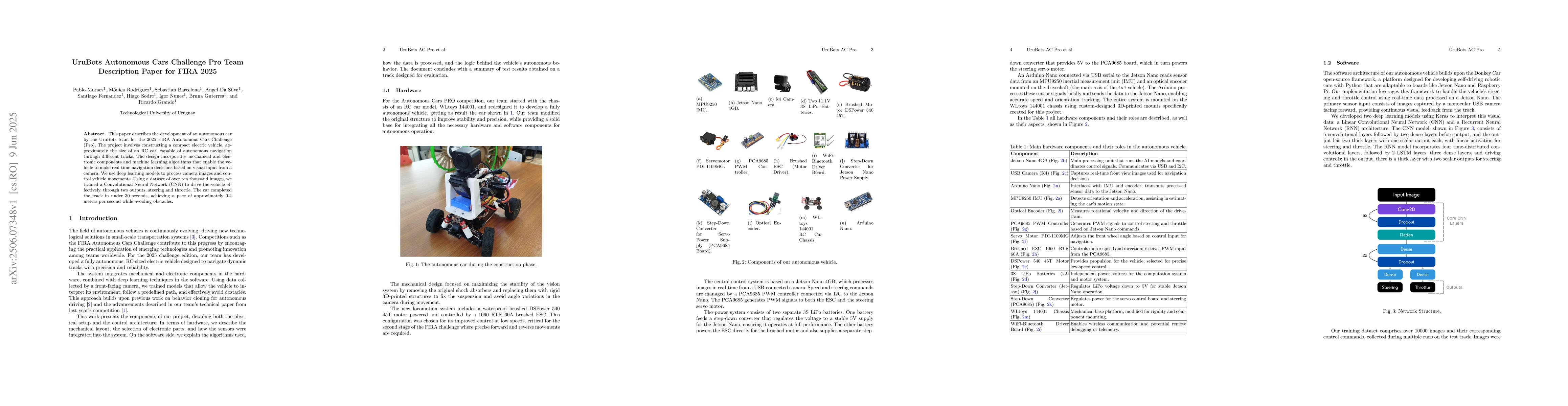 This paper describes the development of an autonomous car by the UruBots team for the 2025 FIRA Autonomous Cars Challenge (Pro). The project involves constructing a compact electric vehicle, approximately the size of an RC car, capable of autonomous navigation through different tracks. The design incorporates mechanical and electronic components and machine learning algorithms that enable the vehicle to make real-time navigation decisions based on visual input from a camera. We use deep learning models to process camera images and control vehicle movements. Using a dataset of over ten thousand images, we trained a Convolutional Neural Network (CNN) to drive the vehicle effectively, through two outputs, steering and throttle. The car completed the track in under 30 seconds, achieving a pace of approximately 0.4 meters per second while avoiding obstacles.